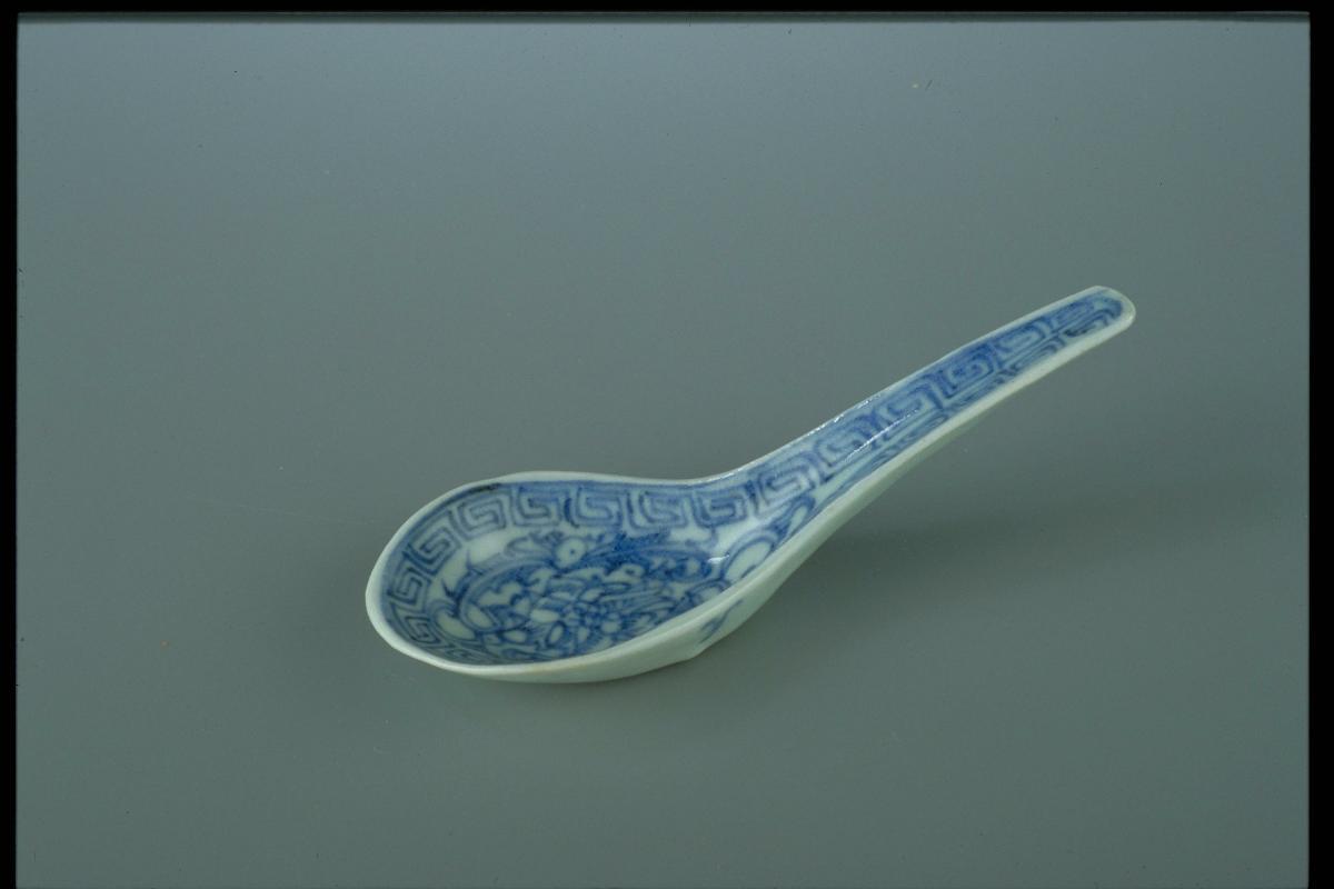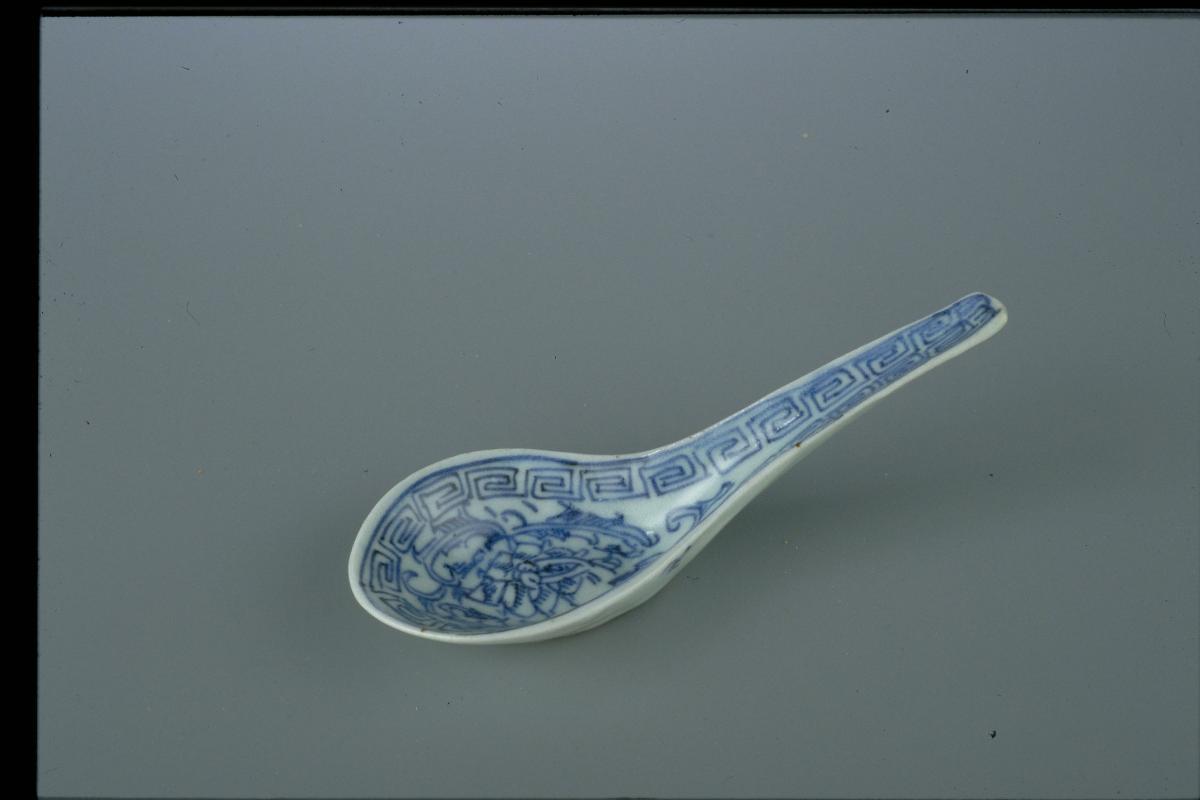 Chinese blue and white porcelain ware was widely used in Southeast Asia. It was cheaper and more durable than polychrome enamel ware. It was used by the Peranakan Chinese mainly for ancestral offerings and for making offerings during funeral ceremonies, as blue (a substitute for black) and white were their traditional colours of mourning. However, such wares were common and thus not exclusive to the Straits Chinese household. This particular spoon features floral and foliage motifs.