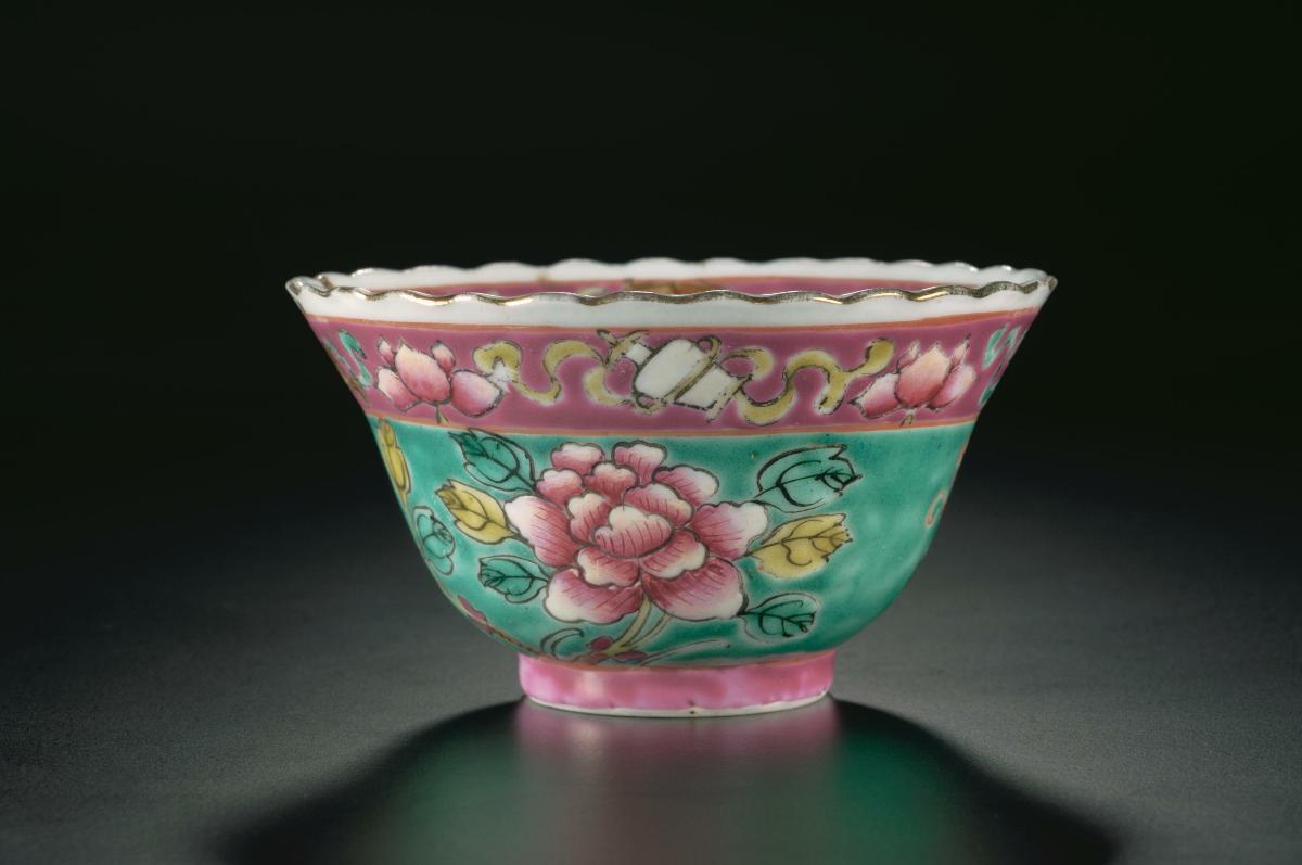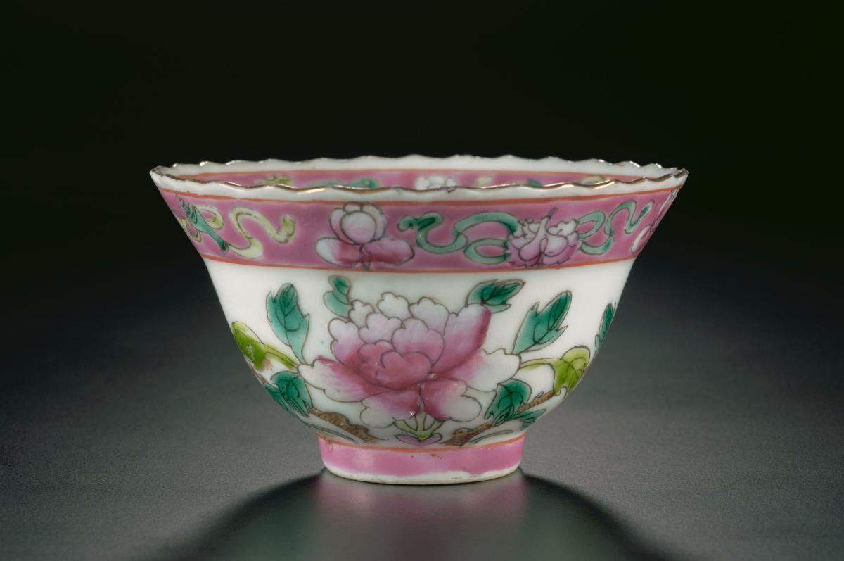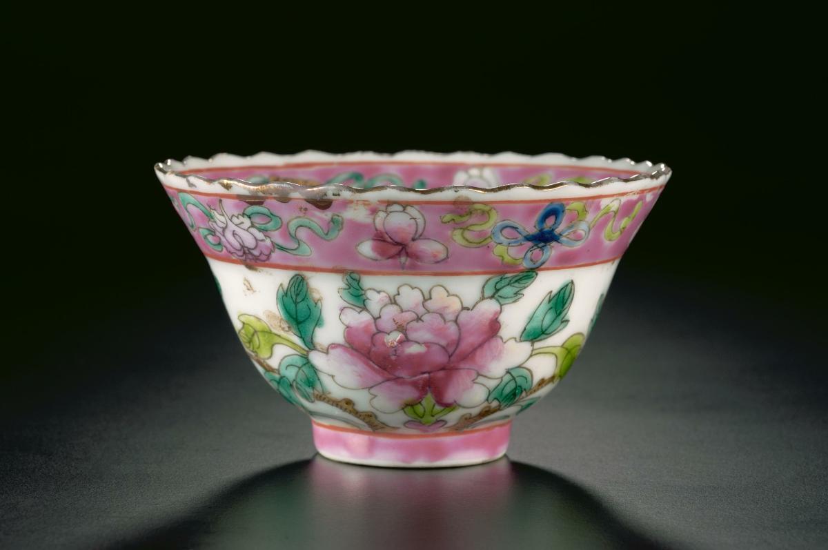 Although most Straits Chinese teacups are small and range in size from 3.5 to 7 cm in diameter, there are also larger teacups which come together with matching covers. This particular teacup has a scalloped rim with gilded edges and depicts birds, sprigs of flowering plants and rockery on a plain white porcelain ground.