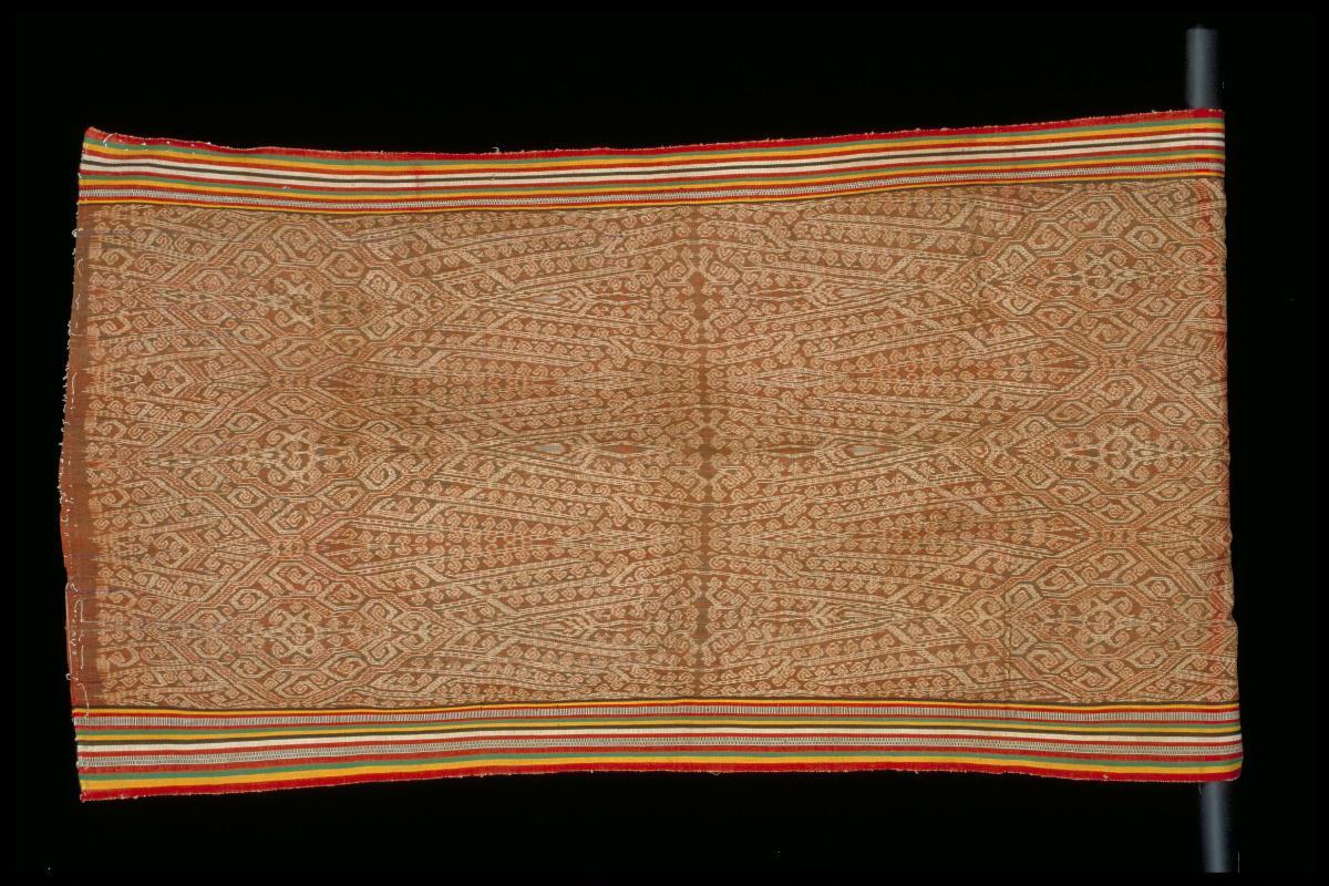This piece of skirt, known as ‘malong’ belongs to the Iban people of Sarawak—north Borneo that lies within the political boundary of Malaysia. Such patterned skirts were reserved for ritual use, for instance during the washing of ritual rice, laying out plates for offering, and when receiving the liver of the ritually slaughtered pig. The skirt is patterned using the ‘warp ikat’ technique, where the vertical threads are tied and dyed before the fabric is woven. Although the patterns on skirts may be complex, the weaving of skirts is not considered ritually dangerous, unlike the weaving of ceremonial cloth.