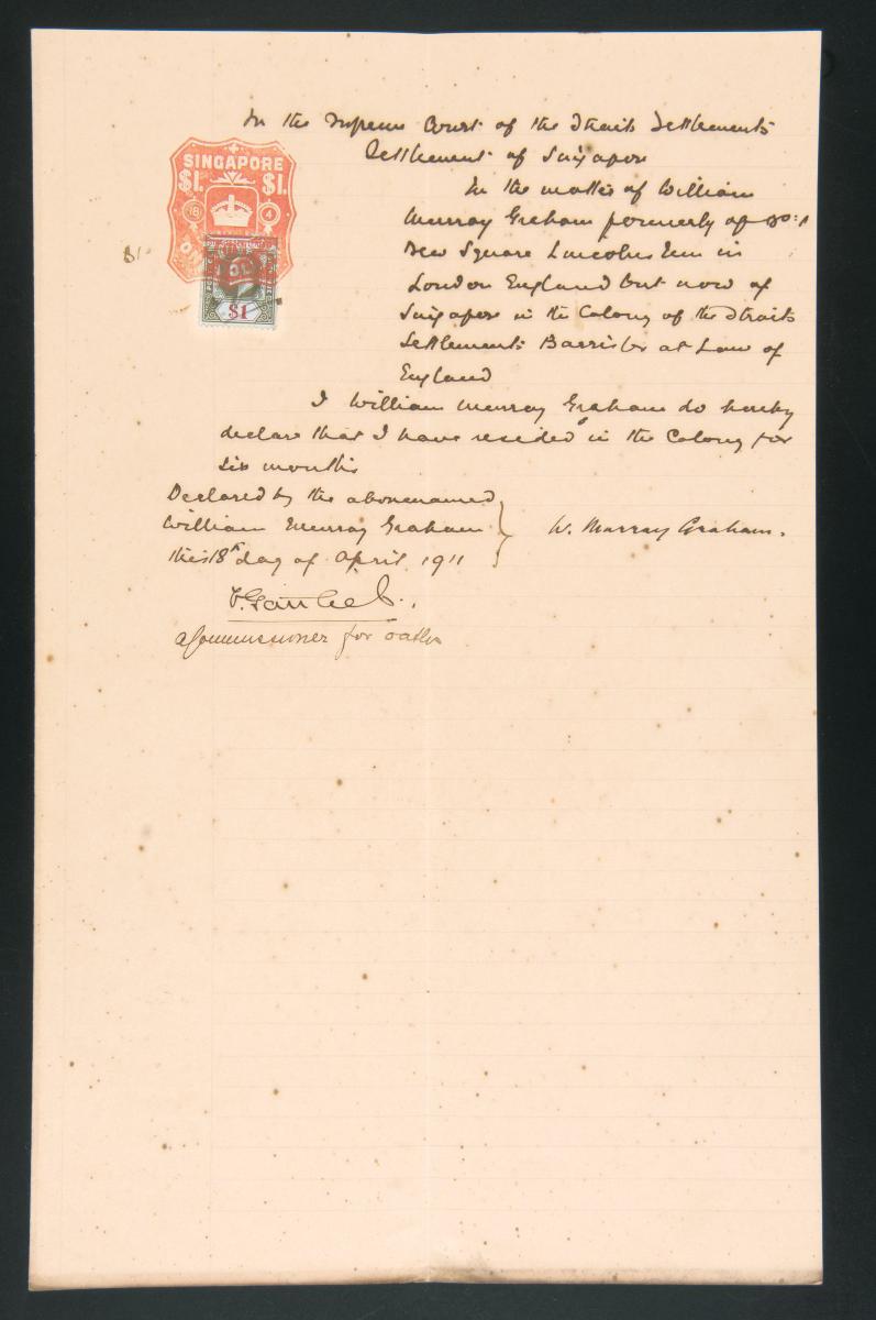 This is an oath sworn by William Murray Graham made on 18 April 1911. It is part of a collection of legal documents from the 19th and early 20th centuries which provides a glimpse into the work of the notable personalities who left their mark on Singapore’s legal history, and the economic and other transactions undertaken by ordinary immigrants in 19th century Singapore that tell stories of misfortune and indebtedness which would otherwise have disappeared from history.