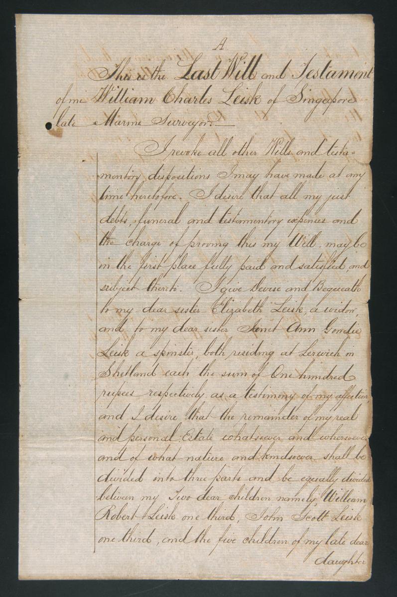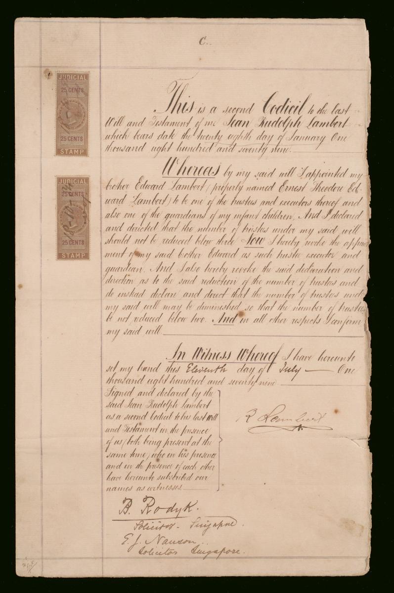 This is the codicil to the last will and testament of William Henry Miles published on 4 April 1853. It is part of a collection of legal documents from the 19th and early 20th centuries which provides a glimpse into the work of the notable personalities who left their mark on Singapore’s legal history, and the economic and other transactions undertaken by ordinary immigrants in 19th century Singapore that tell stories of misfortune and indebtedness which would otherwise have disappeared from history.