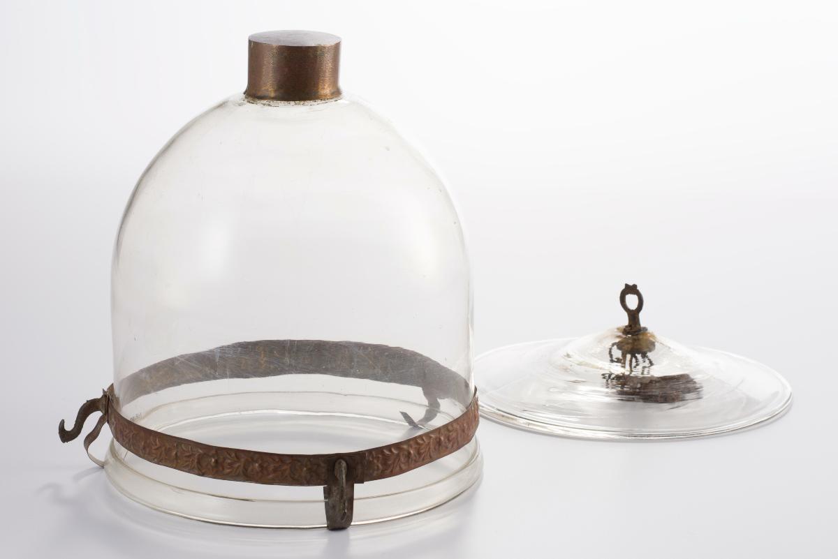 This hand-blown glass lamp is found in a Chettiar temple. Chettiars are a Tamil-speaking, moneylending business community who are also staunch Shaiva-Skanda (worshippers of Shiva and Murugan) devotees.The lamp's glass is made from lead oxide (instead of the standard lime) added to the potash, which is derived from burned wood and bracken. Blown glass can be shaped entirely by hand. Here, the lamp is made by blowing into a mould, which provides the entire shape of the final product. Moulds are usually made of iron, but today they can be brass, wood or aluminum.