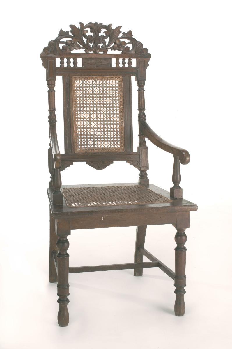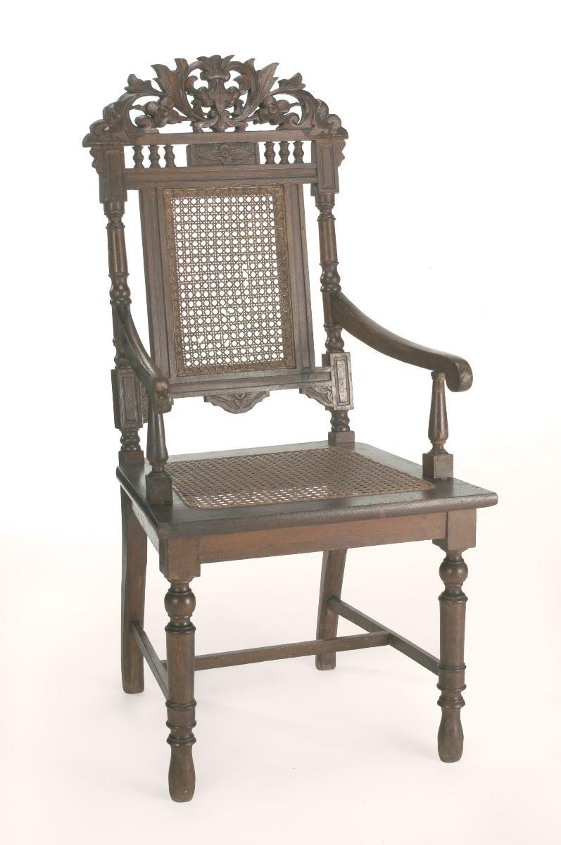 This teak armchair with a rattan back and base is a local copy of European furniture featuring Victorian hybrid revival designs. Floral and scrolled motifs decorate the backrest and curved legs of the chair, with details picked out in gold leaf. The English originals did not have any gold leaf, but given the Peranakan’s predilection for red-and-gold, local manufacturers judged that the addition would make the furniture more appealing to the Peranakan market. The customisation of European-style furniture to suit Peranakan taste was to develop later into a full-blown hybrid style combining Chinese and European forms and decorations that was uniquely Peranakan.