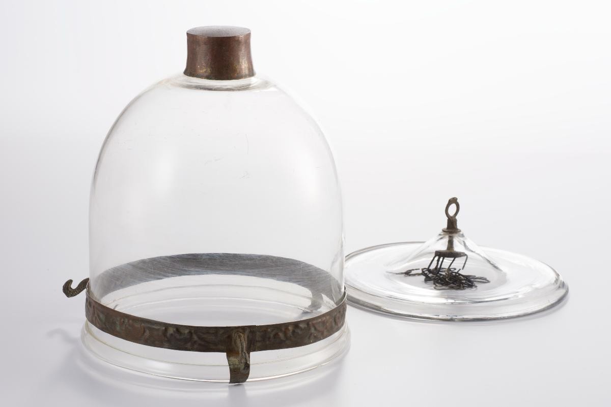 This hand-blown glass lamp is found in a Chettiar temple. Chettiars are a Tamil-speaking, moneylending business community who are also staunch Shaiva-Skanda (worshippers of Shiva and Murugan) devotees.The lamp's glass is made from lead oxide (instead of the standard lime) added to the potash, which is derived from burned wood and bracken. Blown glass can be shaped entirely by hand. Here, the lamp is made by blowing into a mould, which provides the entire shape of the final product. Moulds are usually made of iron, but today they can be brass, wood or aluminum.