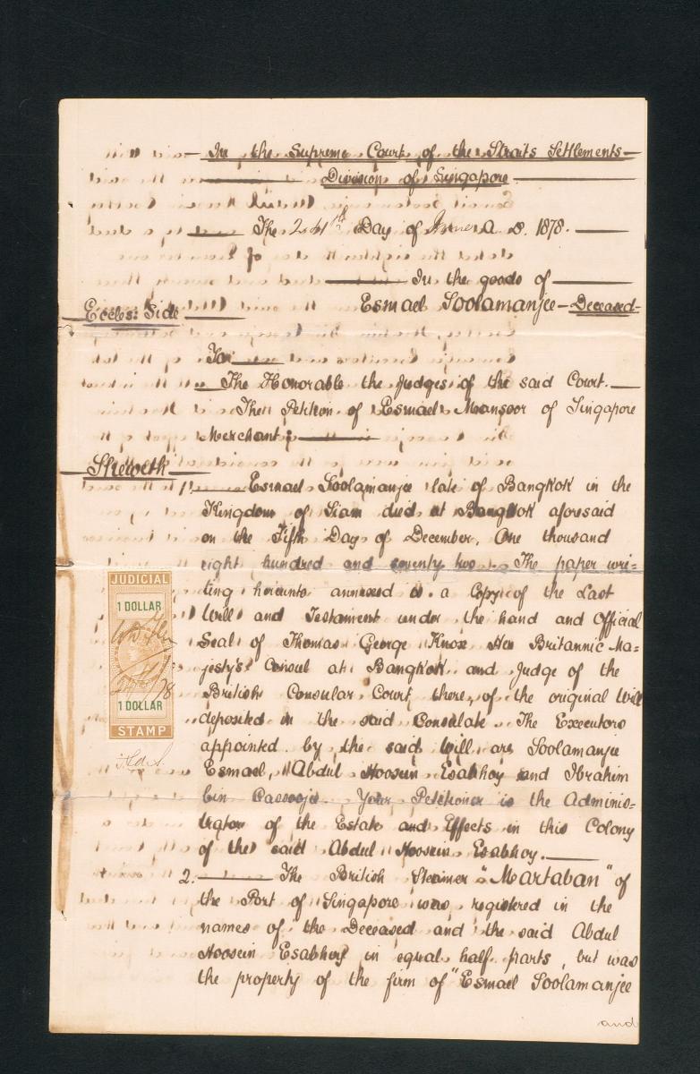 This is the petition of Soopramania Padayachee concerning the administration of the estate of Samee Padayachee. It is part of a collection of legal documents from the 19th and early 20th centuries which provides a glimpse into the work of the notable personalities who left their mark on Singapore’s legal history, and the economic and other transactions undertaken by ordinary immigrants in 19th century Singapore that tell stories of misfortune and indebtedness which would otherwise have disappeared from history.
