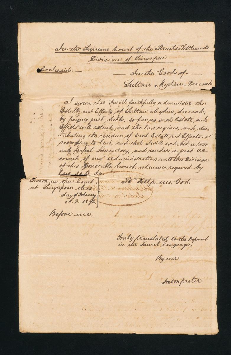This is an oath sworn by Dooroosamy of Singapore on 13 March 1877 concerning the administration of the estate of the deceased Tan Poh Je. It is part of a collection of legal documents from the 19th and early 20th centuries which provides a glimpse into the work of the notable personalities who left their mark on Singapore’s legal history, and the economic and other transactions undertaken by ordinary immigrants in 19th century Singapore that tell stories of misfortune and indebtedness which would otherwise have disappeared from history.