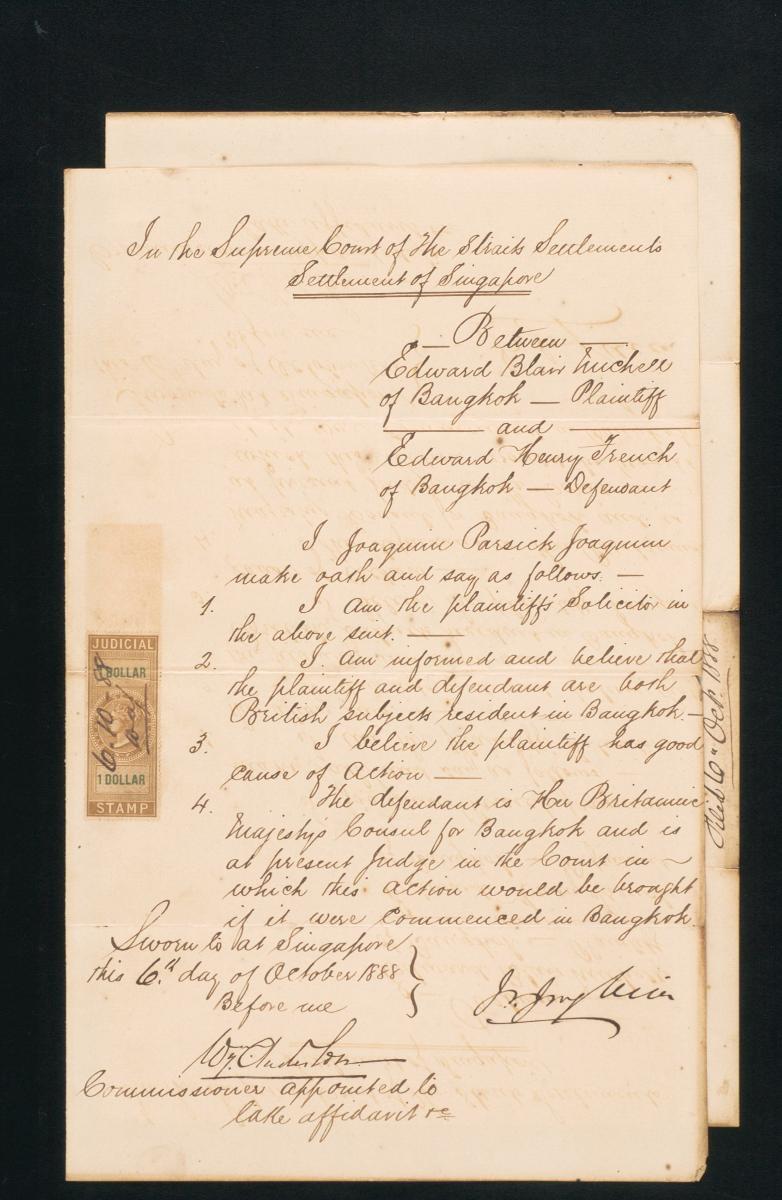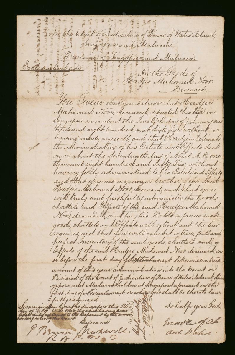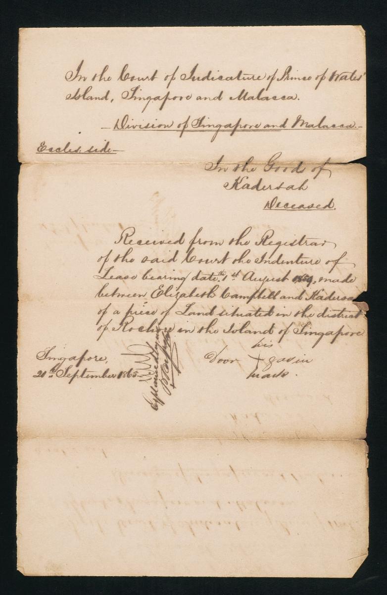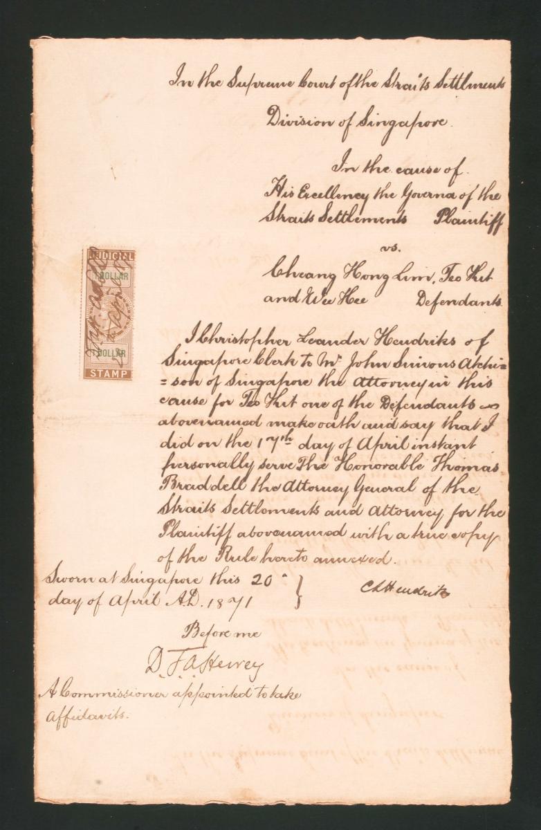 This is an affidavit of service sworn by Kadersah on 11 September 1889 concerning the suit between Meyna Chayna Allagappa Chitty (plaintiff) and Kavena Chayna Said Ibrahim (defendant). It is part of a collection of legal documents from the 19th and early 20th centuries which provides a glimpse into the work of the notable personalities who left their mark on Singapore’s legal history, and the economic and other transactions undertaken by ordinary immigrants in 19th century Singapore that tell stories of misfortune and indebtedness which would otherwise have disappeared from history.