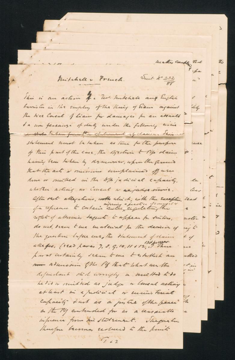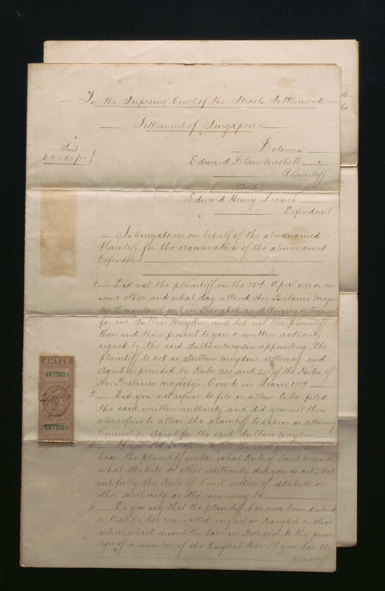This is a document concerning the suit between Edward Blair Michell of Bangkok (plaintiff) and Edward Henry French of Bangkok (defendant) issued on 29 November 1888 by the solicitors for the defendant, Rodyk and Davidson. It is part of a collection of legal documents from the 19th and early 20th centuries which provides a glimpse into the work of the notable personalities who left their mark on Singapore’s legal history, and the economic and other transactions undertaken by ordinary immigrants in 19th century Singapore that tell stories of misfortune and indebtedness which would otherwise have disappeared from history.