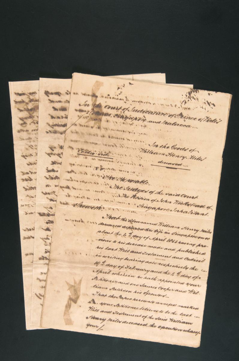 This is an account of the monies received by the petitioners (Pakeam and Logan) from the estate of Henry Charles Gladwell, in relation to the suit between Pakeam and Logan and Leby Henry Gottlieb. It is part of a collection of legal documents from the 19th and early 20th centuries which provides a glimpse into the work of the notable personalities who left their mark on Singapore’s legal history, and the economic and other transactions undertaken by ordinary immigrants in 19th century Singapore that tell stories of misfortune and indebtedness which would otherwise have disappeared from history.