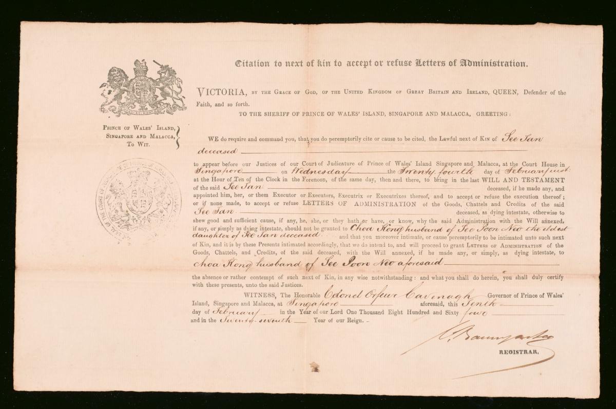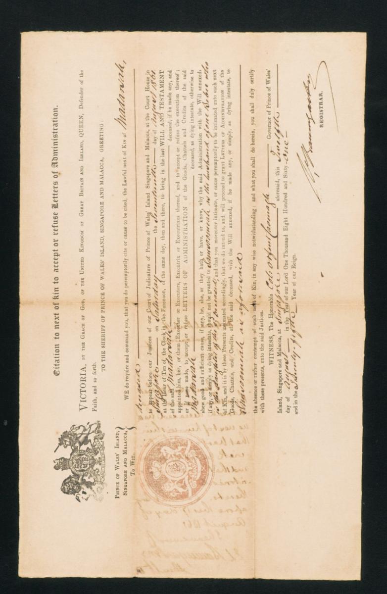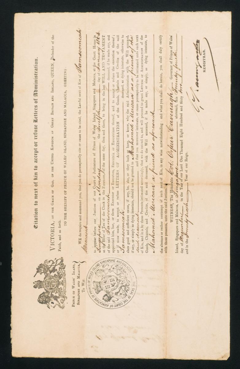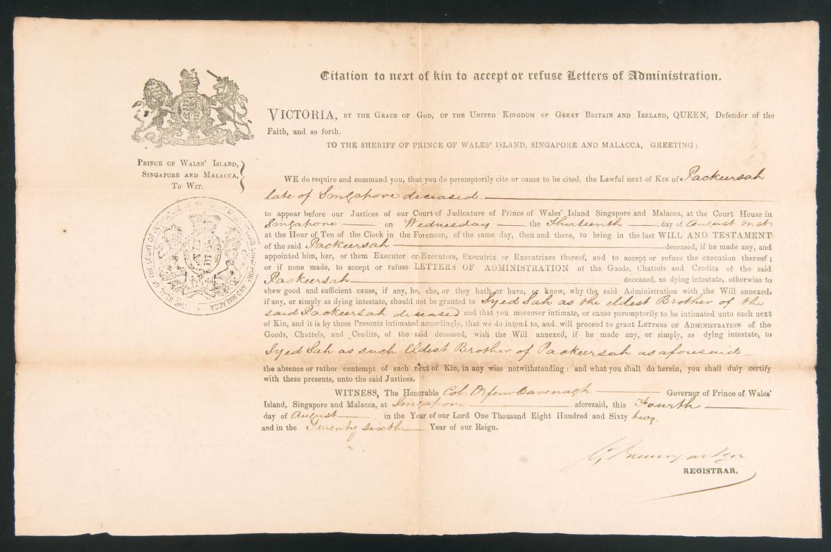 This is a citation issued on 21 November 1865 to the next of kin of Syed Ally Bin Allowee Al Jooffree requesting that they accept or refuse the letters of administration for the estate of the deceased. It is part of a collection of legal documents from the 19th and early 20th centuries which provides a glimpse into the work of the notable personalities who left their mark on Singapore’s legal history, and the economic and other transactions undertaken by ordinary immigrants in 19th century Singapore that tell stories of misfortune and indebtedness which would otherwise have disappeared from history.
