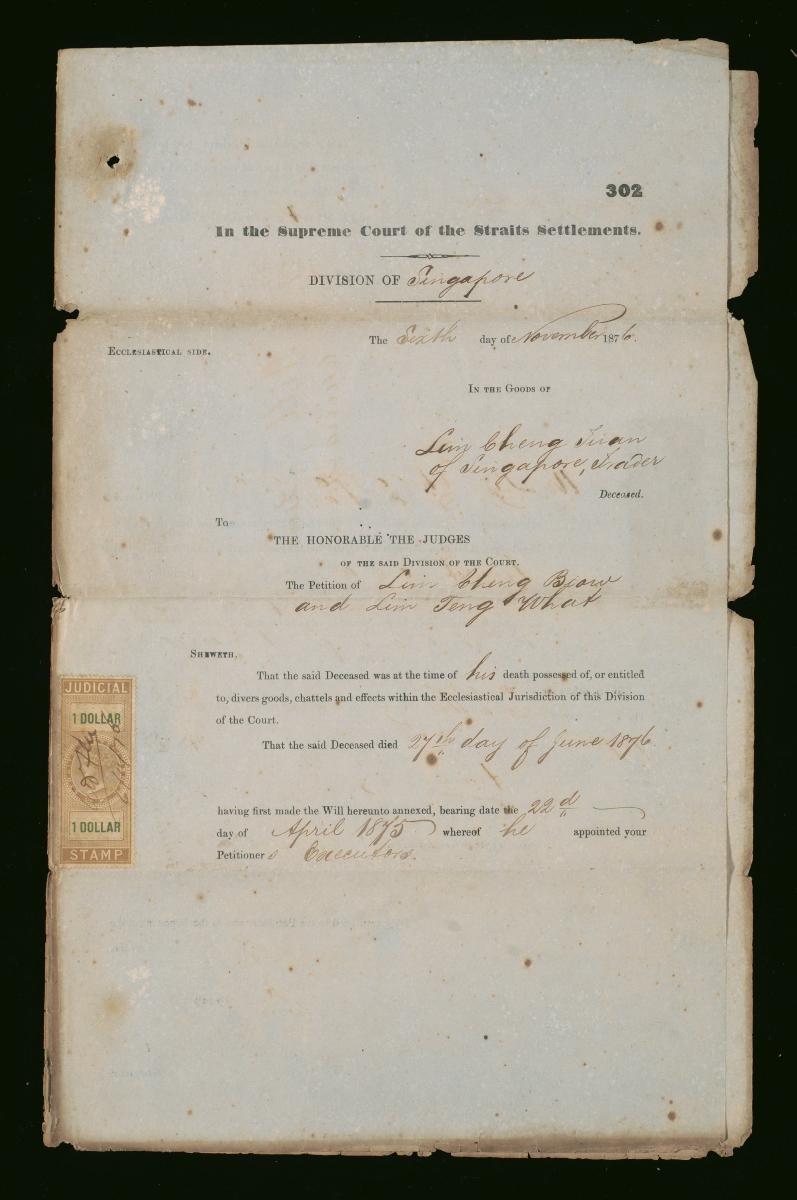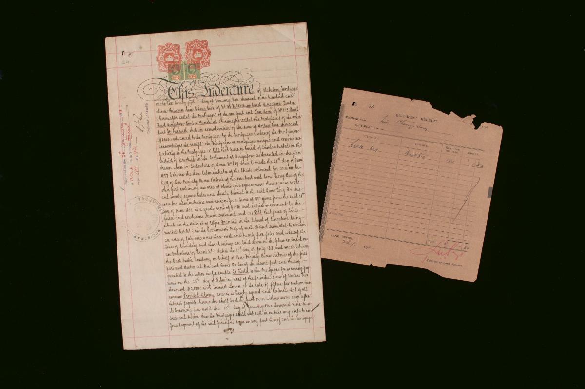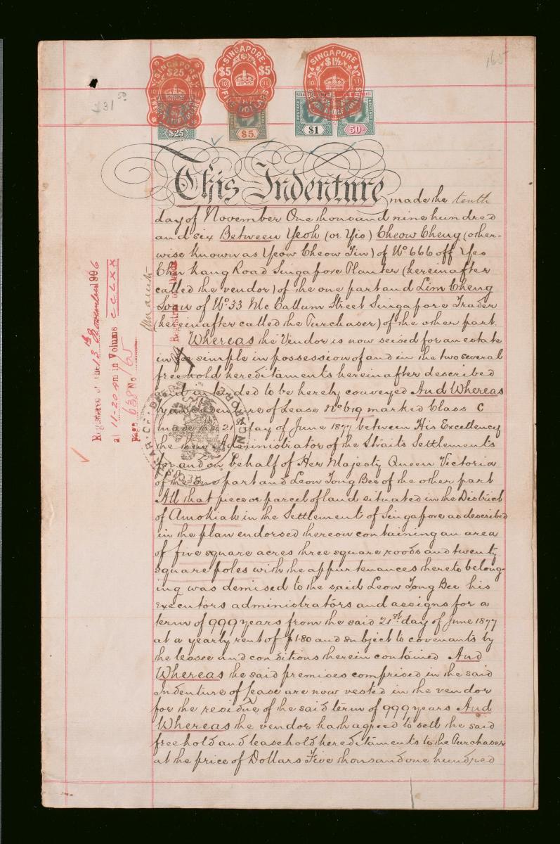 This is an indenture made on 19 April 1911 concerning Lim Cheng Soon, Tan Kwee Wah, and Ang Boon Kian of Singapore. It is part of a collection of legal documents from the 19th and early 20th centuries which provides a glimpse into the work of the notable personalities who left their mark on Singapore’s legal history, and the economic and other transactions undertaken by ordinary immigrants in 19th century Singapore that tell stories of misfortune and indebtedness which would otherwise have disappeared from history.