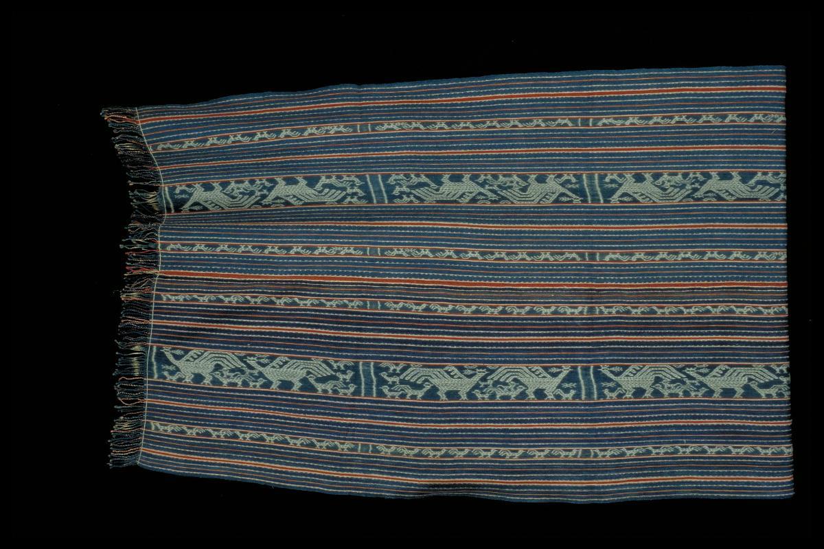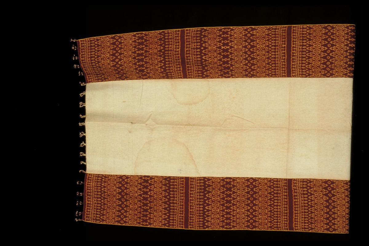 This white netted ‘selendang’ (shoulder cloth) with red, green, blue, pink, brown and yellow embroidery belonged to former First Lady, Puan Noor Aishah, the wife of Singapore’s first President, Mr. Yusof Ishak.Puan Noor Aishah would buy fabrics from Arab Street or High Street and make her own ‘selendang’ and clothes. She is often depicted in photographs wearing the ‘sarong kebaya’ (an open tunic fastened with brooches worn with a sarong) with a ‘selendang’ draped over her shoulders.