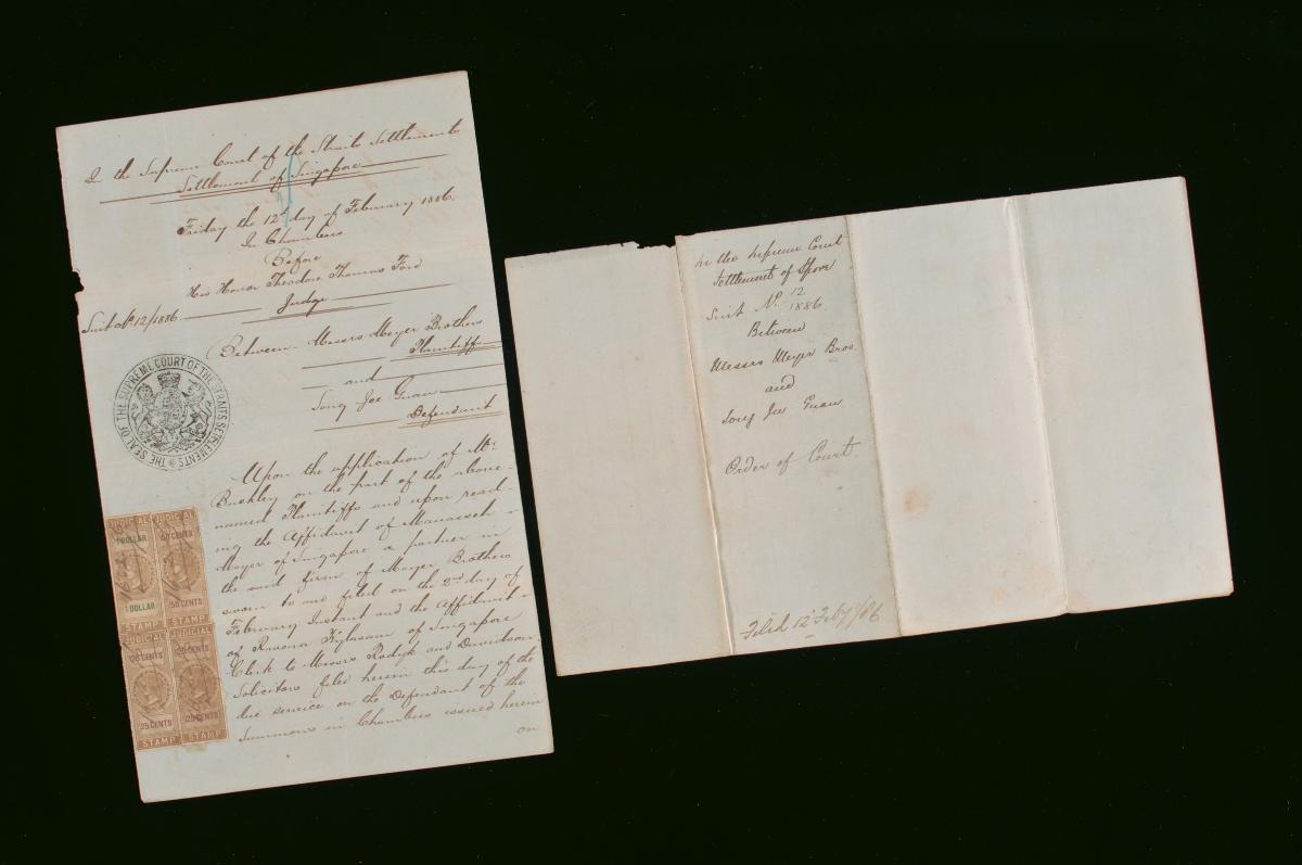 This is an order issued by the Supreme Court of the Straits Settlements, Division of Singapore on 8 June 1870 concerning the suit between William Wemyss Ker, William Paterson, Henry Minchin Simons, Thomas Shelford and William Guiseppe Gullaud (plaintiffs) and Lim Eng Tuan (defendant). The court ordered the sale of the property of the defendant which was seized by the Sheriff of Singapore under the Writ of Sequestration dated 3 May 1870. This document is part of a collection of legal documents from the 19th and early 20th centuries which provides a glimpse into the work of the notable personalities who left their mark on Singapore’s legal history, and the economic and other transactions undertaken by ordinary immigrants in 19th century Singapore that tell stories of misfortune and indebtedness which would otherwise have disappeared from history.