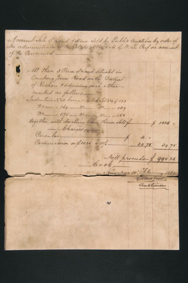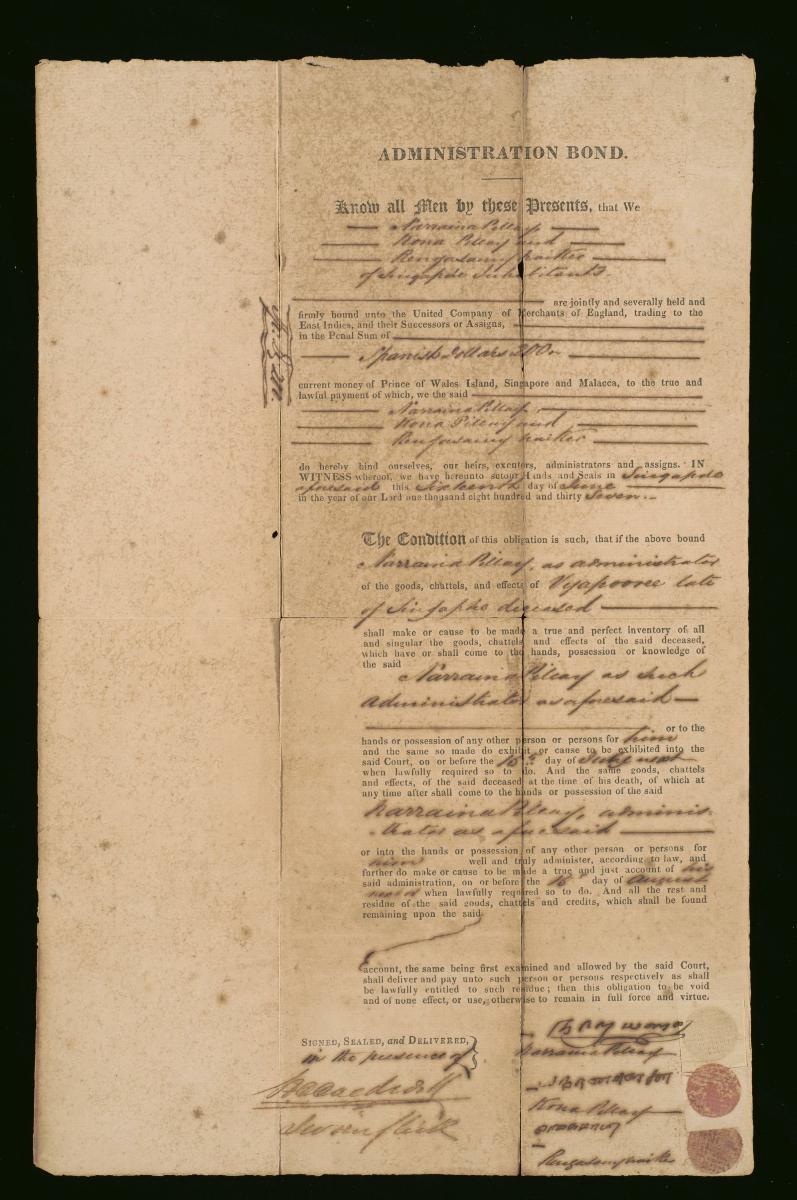 These are the accounts of the estate of Kurpa Naiker published on 28 February 1868, which were sold by public auction upon the orders of the executor of the estate, Narraina Chitty. They are part of a collection of legal documents from the 19th and early 20th centuries which provides a glimpse into the work of the notable personalities who left their mark on Singapore’s legal history, and the economic and other transactions undertaken by ordinary immigrants in 19th century Singapore that tell stories of misfortune and indebtedness which would otherwise have disappeared from history.