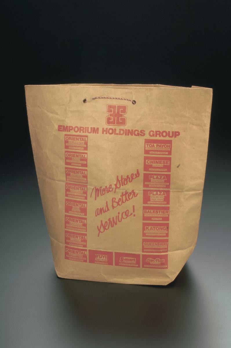 Overseas Emporium Pte Ltd (中桥百货有限公) was located at People’s Park Complex.Between the 1950s and 1980s, carrier bags were either made of plastic or paper, although the latter was the favoured material up to the 1980s. The main types of paper used in paper bag making were imported kraft paper and wrapping paper. Rectangular pieces of cardboard were glued to the base and handles to make the bag sturdier. The final step was to tie the red and white cotton twine, which was imported from China, to the bag or to cut out the handles from the bag. Most carrier bags were aesthetically appealing and informative. The space on the bag was transformed into visually captivating advertisements to promote products and services. When carried around, the bag became ‘walking’ advertisements.