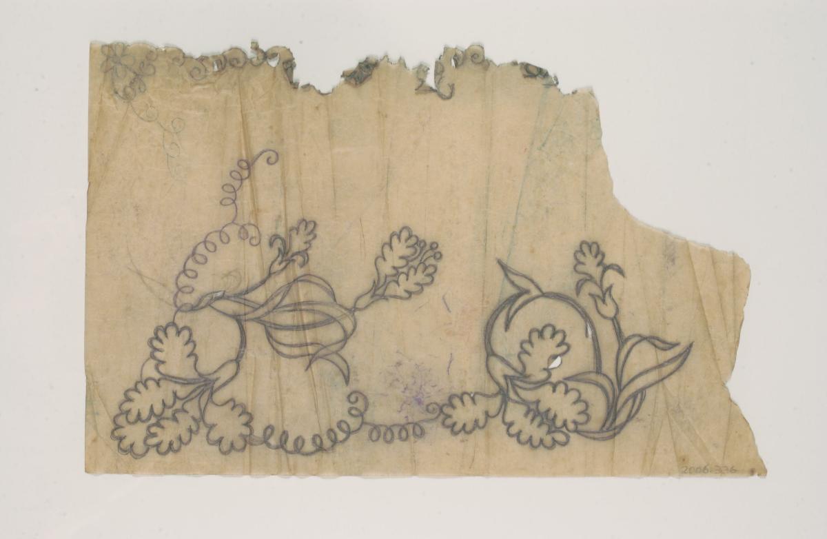 This is a paper stencil of a motif that is embroidered on a kebaya, which is a traditional long-sleeved tunic worn by Peranakan women. Kebaya embroidery designs were drawn first on pieces of paper and then copied onto tracing papers. These patterned tracing papers served as stencils as they were usually pinned in place beneath the blouse, and the designs would then be sewn in accordingly. The paper stencils were accumulated by Peranakan women and they became veritable portfolios of sketches and patterns that were passed down over generations.