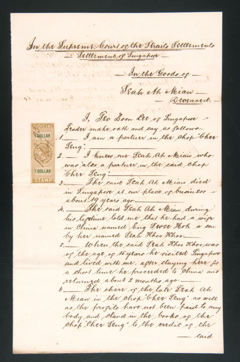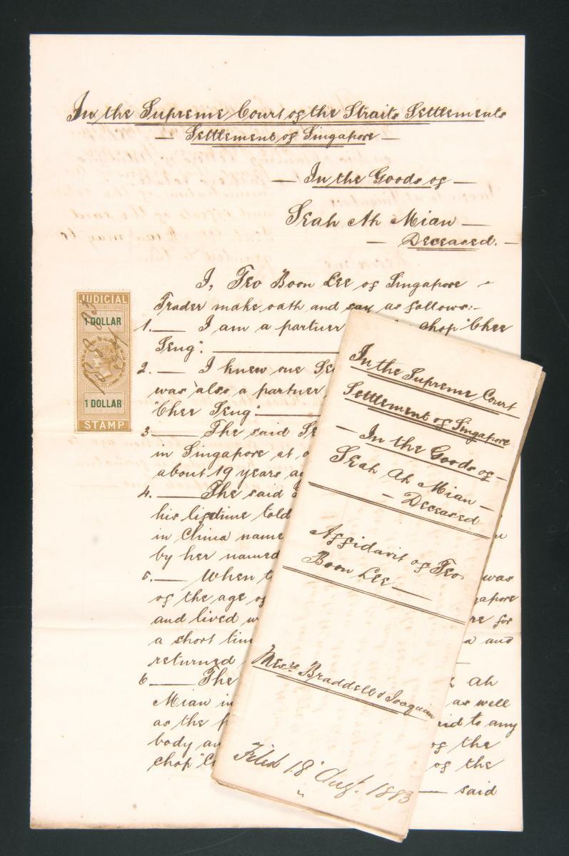 This is an oath sworn by Lee Leong Hong on 22 May 1883 concerning the administration of the estate of the deceased Quay Leong Hin. It is part of a collection of legal documents from the 19th and early 20th centuries which provides a glimpse into the work of the notable personalities who left their mark on Singapore’s legal history, and the economic and other transactions undertaken by ordinary immigrants in 19th century Singapore that tell stories of misfortune and indebtedness which would otherwise have disappeared from history.