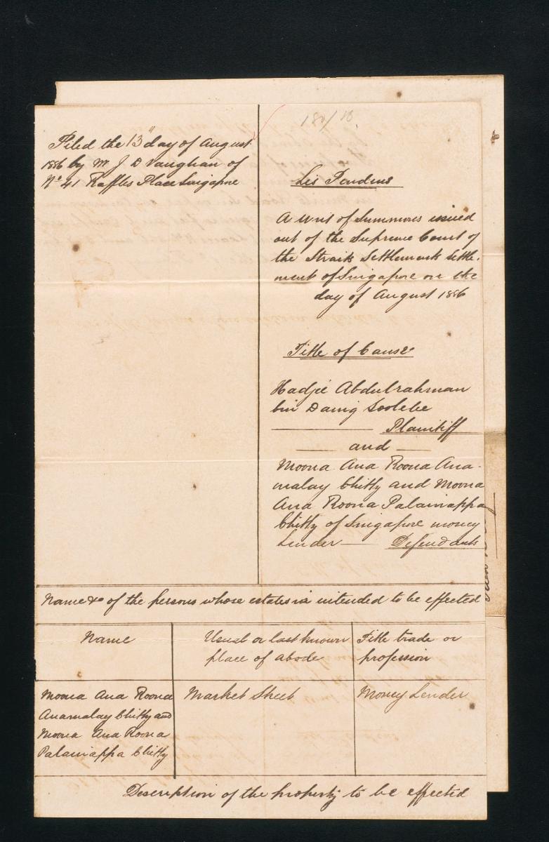 This is a document dated 31 May 1889 concerning the case between Ana Lana Choona Pava Fama Lava Choobalingam Chitty (plaintiff) and Ng Cheng Kiang (otherwise known as Wee Cheng Kiang), Tan Choo Lam, and Chop Yong Seng (defendants). As the defendants did not respond to the writ of summons, final judgement was entered for the plaintiff against them. This document is part of a collection of legal documents from the 19th and early 20th centuries which provides a glimpse into the work of the notable personalities who left their mark on Singapore’s legal history, and the economic and other transactions undertaken by ordinary immigrants in 19th century Singapore that tell stories of misfortune and indebtedness which would otherwise have disappeared from history.