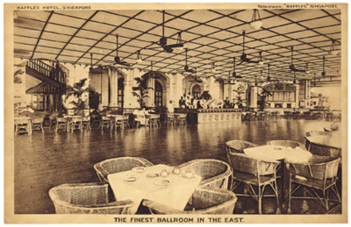 Designed by Swan and Maclaren, Raffles Hotel was established by the Sarkies brothers in 1887. The ballroom, depicted here with ceiling fans, was opened to the public in 1920. It offered patrons the opportunity to indulge in rituals of colonial life such as tea dances and cocktail hours in a comfortable and cool setting.