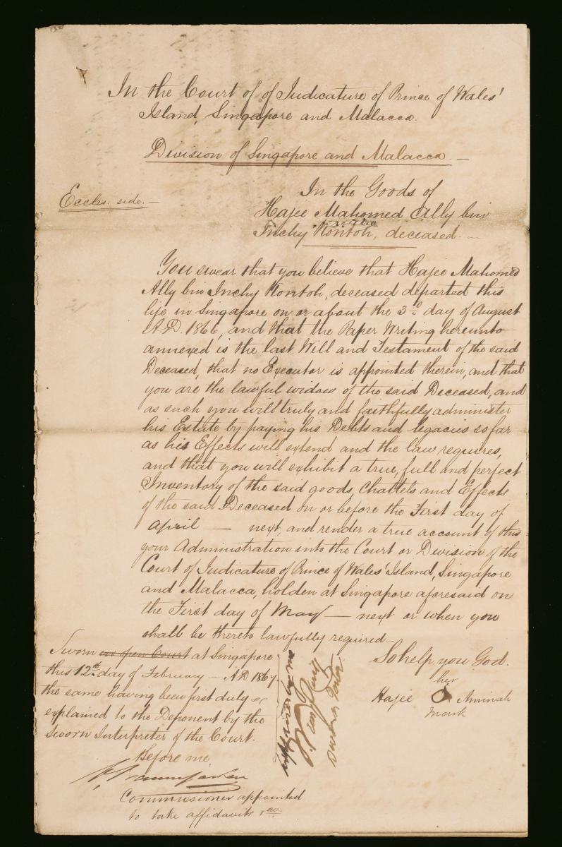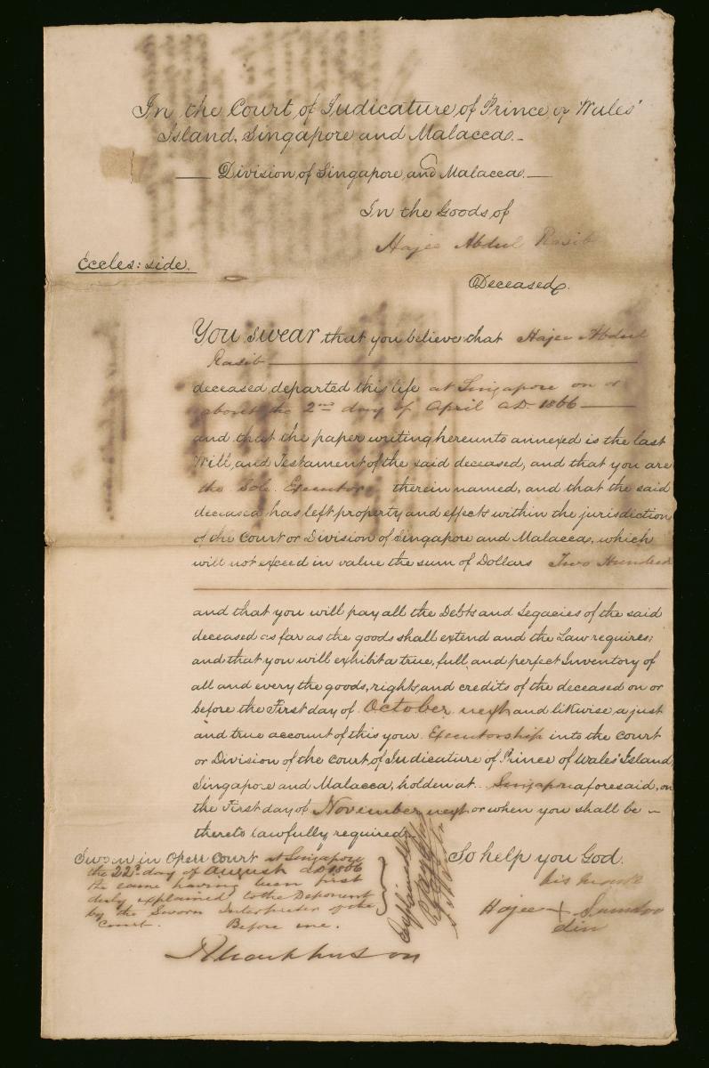 This is the oath sworn on 30 November 1889 by Pochajee Pestorjee, the plaintiff in the suit between the Attorney General, who was acting on behalf of Pestorjee, and Thomas Scott, James Guthrie Davidson, Vamathoy Franjee and Dadabhoy Rustomjee (defendants). It is part of a collection of legal documents from the 19th and early 20th centuries which provides a glimpse into the work of the notable personalities who left their mark on Singapore’s legal history, and the economic and other transactions undertaken by ordinary immigrants in 19th century Singapore that tell stories of misfortune and indebtedness which would otherwise have disappeared from history.