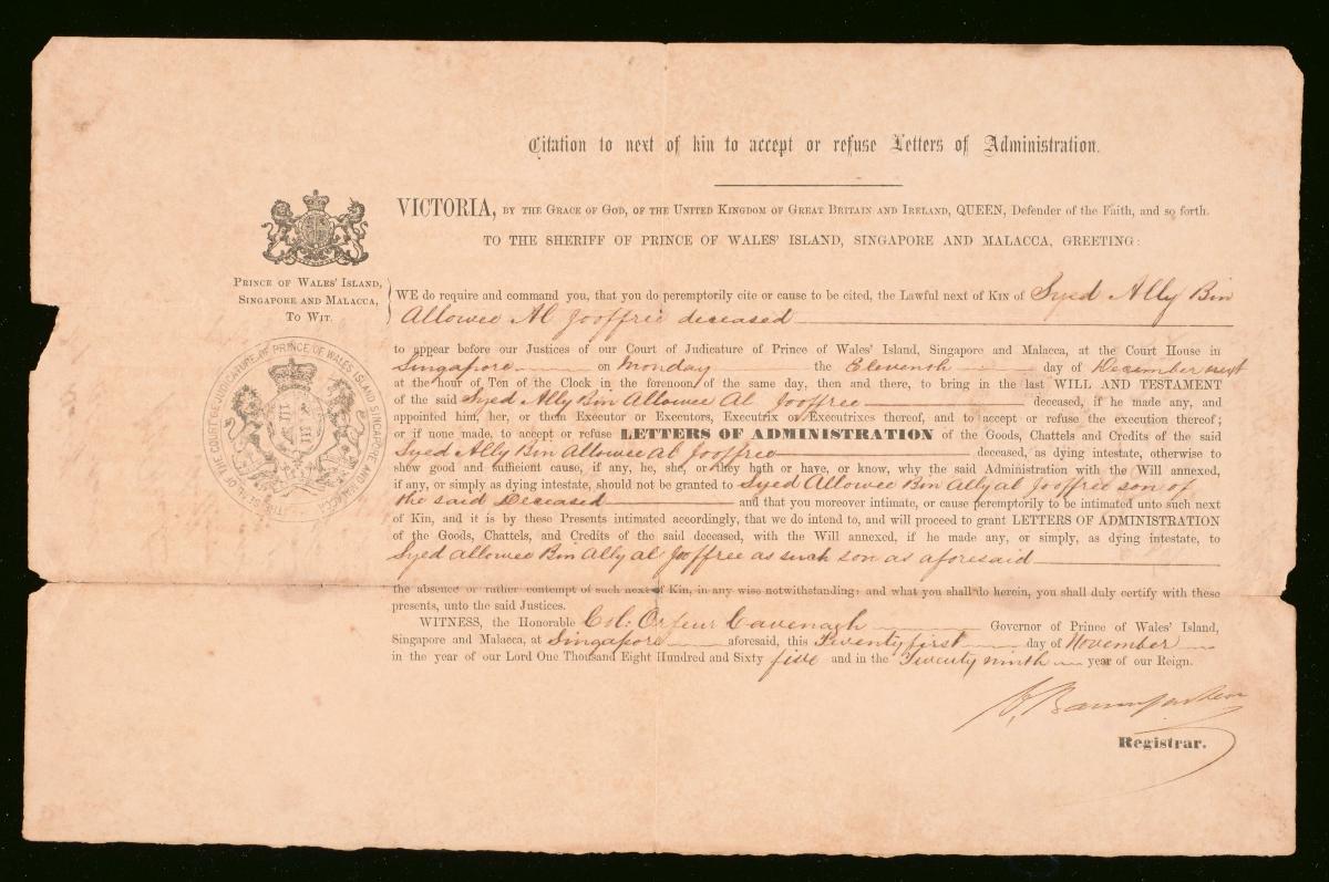 This is a warrant to act issued on 17 November 1865 by Syed Allowee bin Ally Al Jooffree concerning the administration of the estate of the deceased Syed Ally bin Allowee Al Jooffree. It is part of a collection of legal documents from the 19th and early 20th centuries which provides a glimpse into the work of the notable personalities who left their mark on Singapore’s legal history, and the economic and other transactions undertaken by ordinary immigrants in 19th century Singapore that tell stories of misfortune and indebtedness which would otherwise have disappeared from history.