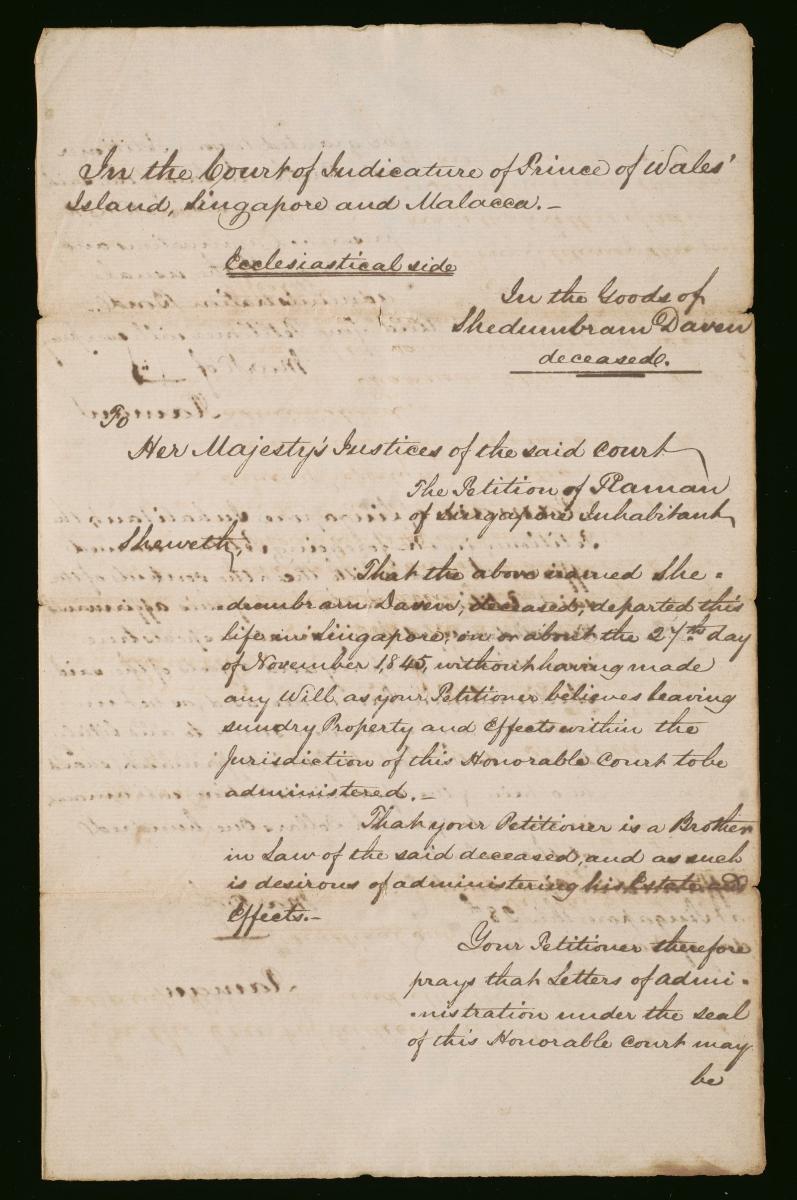 This is the petition of Raman concerning the administration of the estate of the deceased Shedumbram Daven. It is part of a collection of legal documents from the 19th and early 20th centuries which provides a glimpse into the work of the notable personalities who left their mark on Singapore’s legal history, and the economic and other transactions undertaken by ordinary immigrants in 19th century Singapore that tell stories of misfortune and indebtedness which would otherwise have disappeared from history.