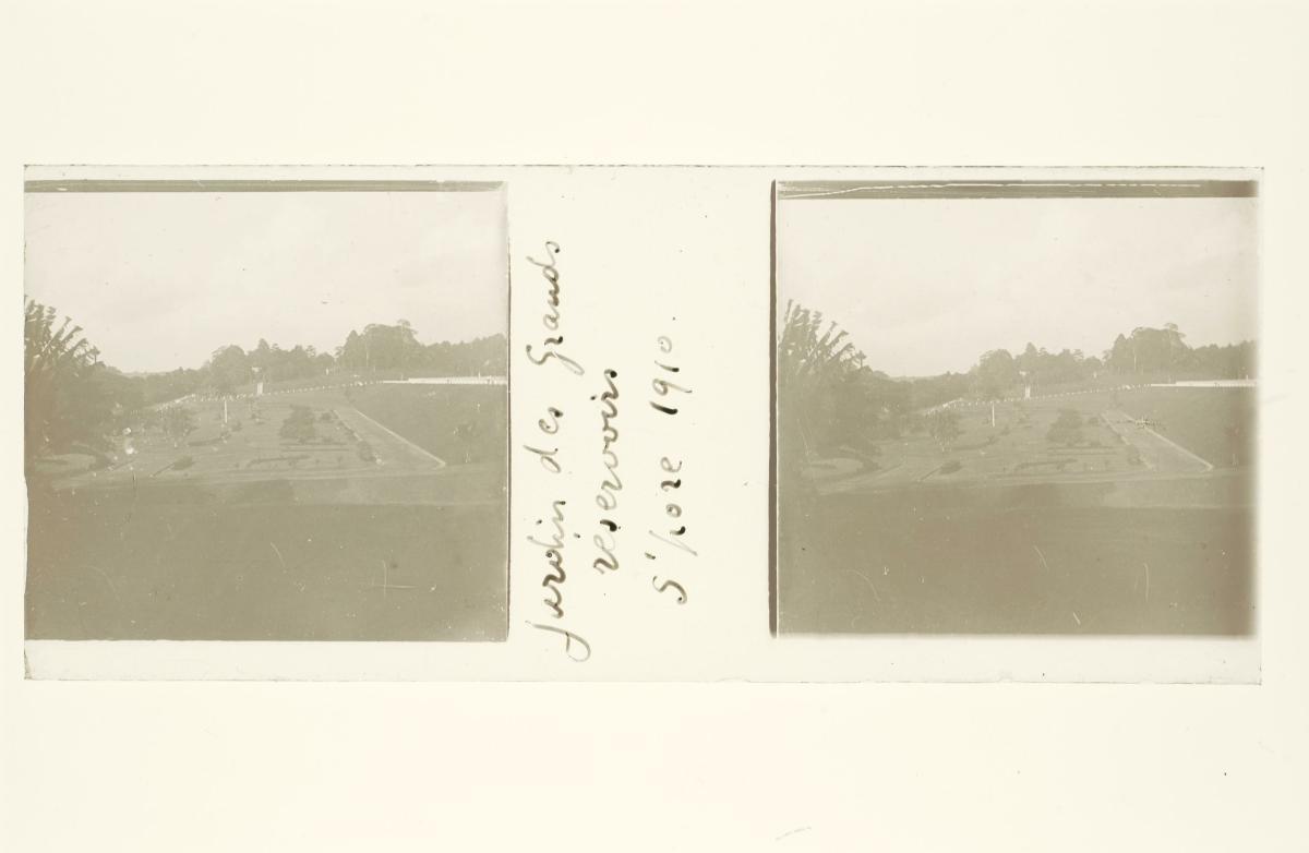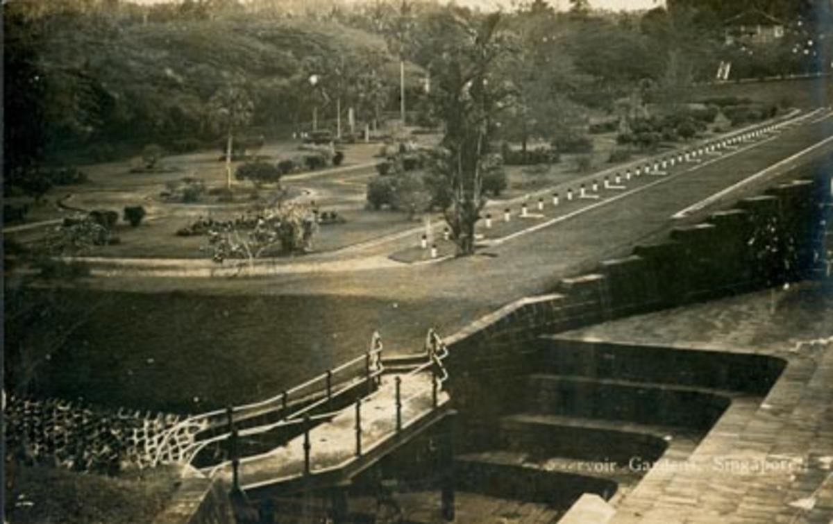 This is a glass stereoscopic slide from the H. Schaefer Collection showing a garden at a reservoir in Singapore.
