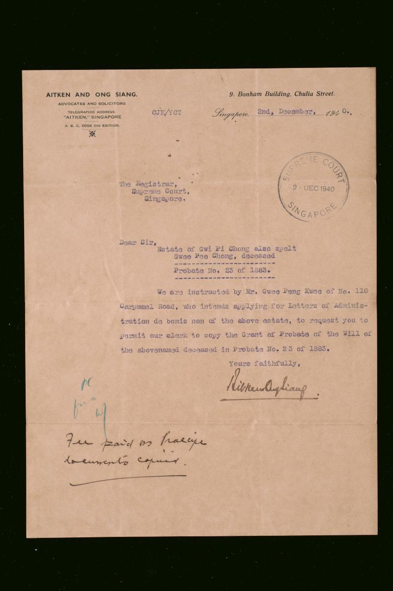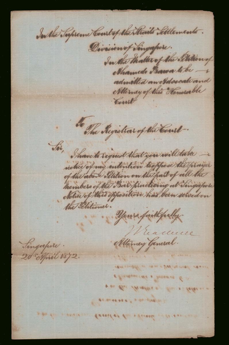 This is a letter written by solicitor J.D. Vaugh on 14 February 1887 and addressed to the Registrar of the Supreme Court of the Straits Settlements. It concerned the suit between Syed Allowee bin Ally Aljunied (plaintiff) and Ravena Mana Ahma Roona Ahma Roona Meyappa Chitty and others (defendants). It is part of a collection of legal documents from the 19th and early 20th centuries which provides a glimpse into the work of the notable personalities who left their mark on Singapore’s legal history, and the economic and other transactions undertaken by ordinary immigrants in 19th century Singapore that tell stories of misfortune and indebtedness which would otherwise have disappeared from history.