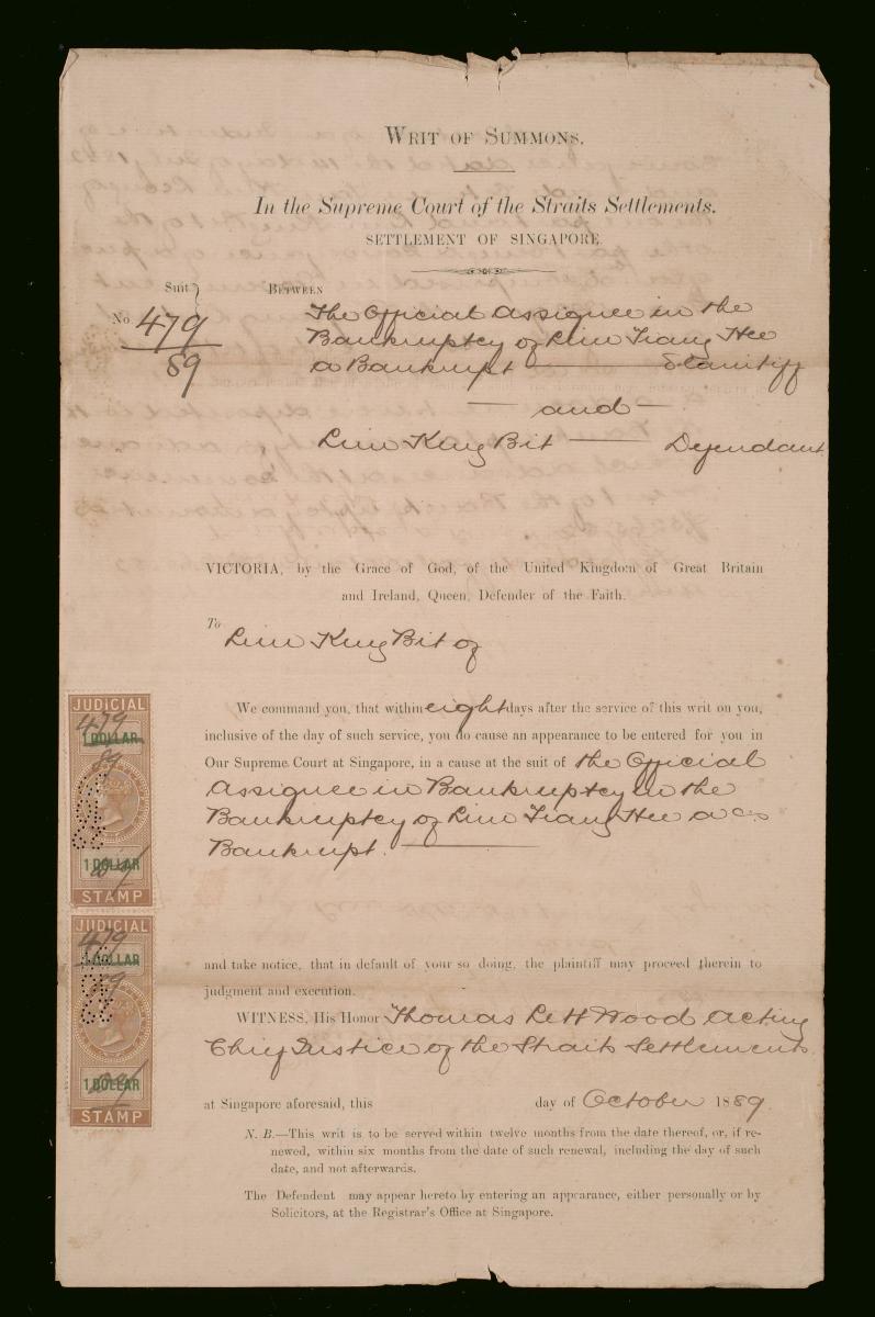 This is a writ of summons issued on 22 October 1889 to Tan Keng Cheow and Chop Kim Hup, the defendants in the suit against the plaintiff, Moona Roona Kana Veerappa Chitty. It is part of a collection of legal documents from the 19th and early 20th centuries which provides a glimpse into the work of the notable personalities who left their mark on Singapore’s legal history, and the economic and other transactions undertaken by ordinary immigrants in 19th century Singapore that tell stories of misfortune and indebtedness which would otherwise have disappeared from history.
