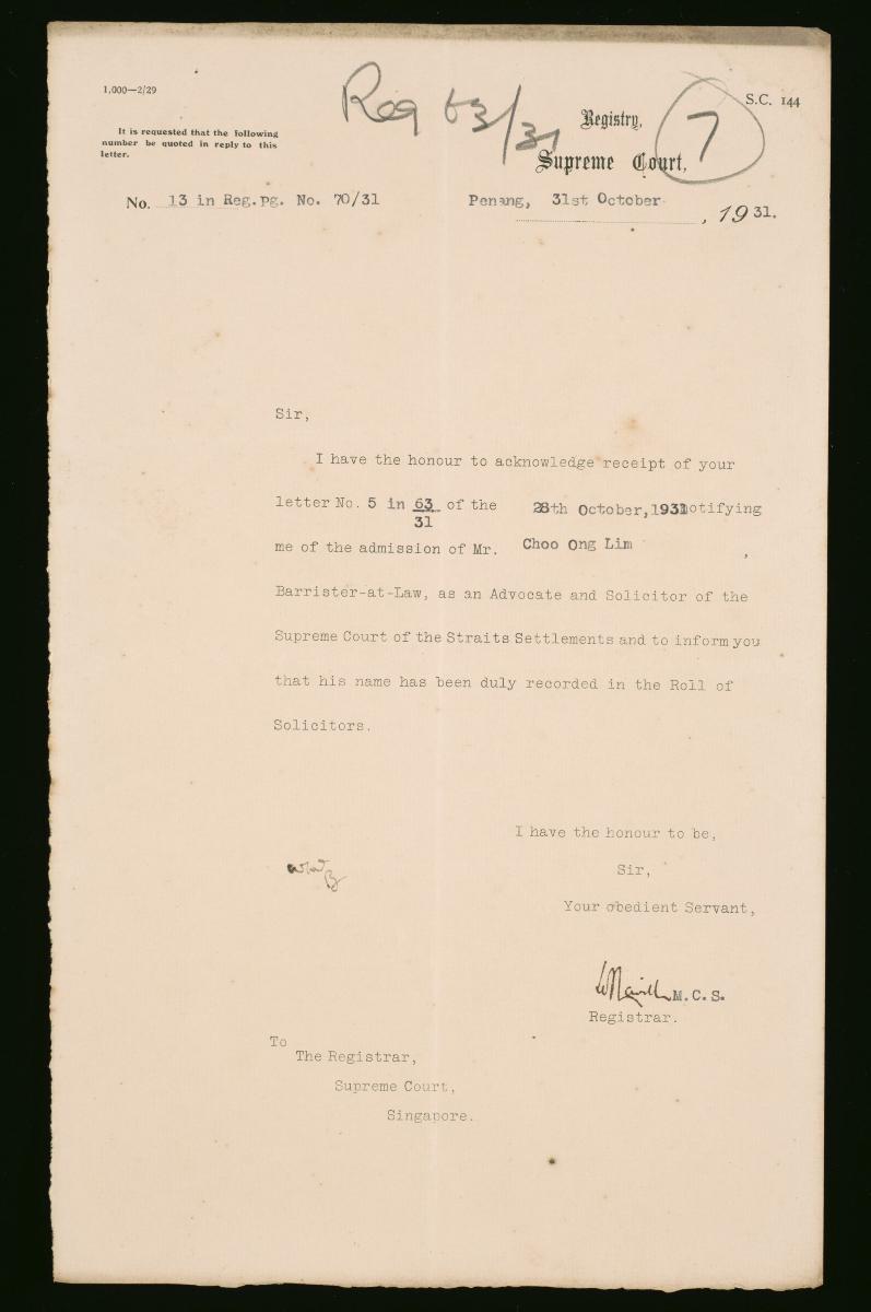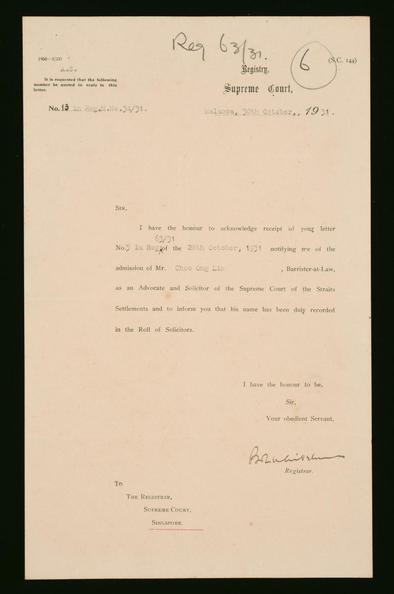 This is a letter dated 2 December 1940 from Aitken and Ong Siang Advocates and Solicitors to the Registrar of the Supreme Court of the Straits Settlements, Division of Singapore. It details the application of Gwee Peng Kwee who intended to apply for the letters of administration de bonis non for the estate of the deceased Gwee Pee Chong. It is part of a collection of legal documents from the 19th and early 20th centuries which provides a glimpse into the work of the notable personalities who left their mark on Singapore’s legal history, and the economic and other transactions undertaken by ordinary immigrants in 19th century Singapore that tell stories of misfortune and indebtedness which would otherwise have disappeared from history.