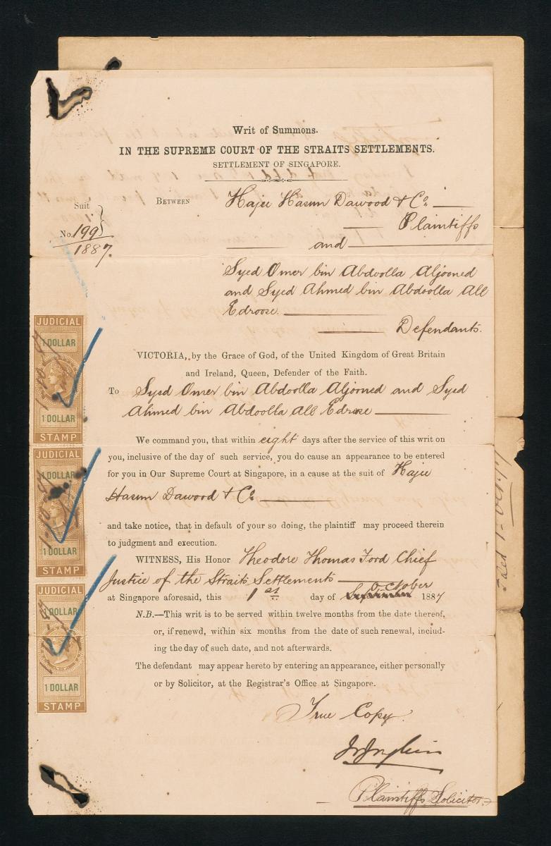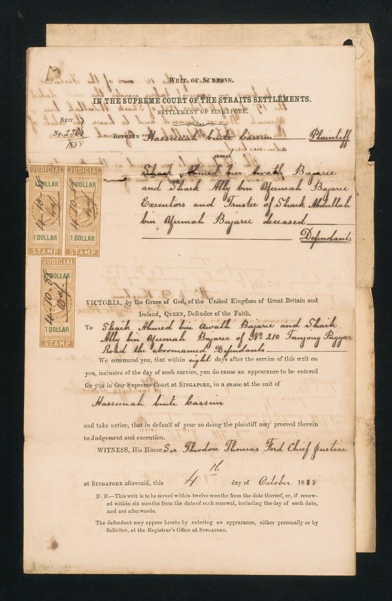This is the writ of summons issued to Bawa Abdul Kutus on 6 October 1888, concerning the suit between Seena Veena Anna Mooroogappa Chitty (plaintiff) and Bawa Abdul Kutus (defendant). It is part of a collection of legal documents from the 19th and early 20th centuries which provides a glimpse into the work of the notable personalities who left their mark on Singapore’s legal history, and the economic and other transactions undertaken by ordinary immigrants in 19th century Singapore that tell stories of misfortune and indebtedness which would otherwise have disappeared from history.