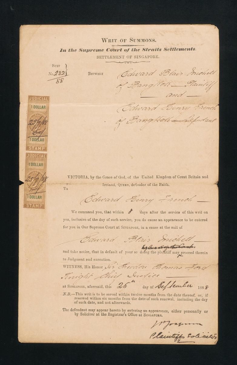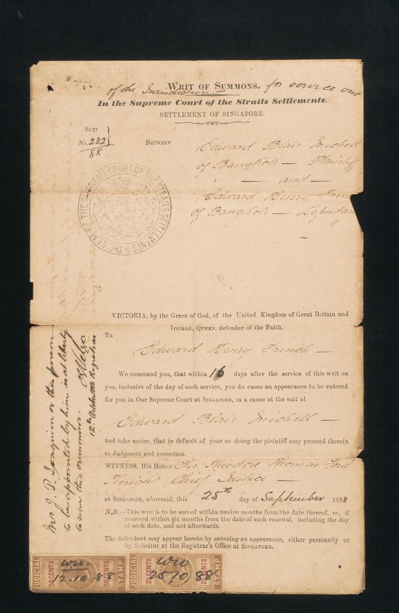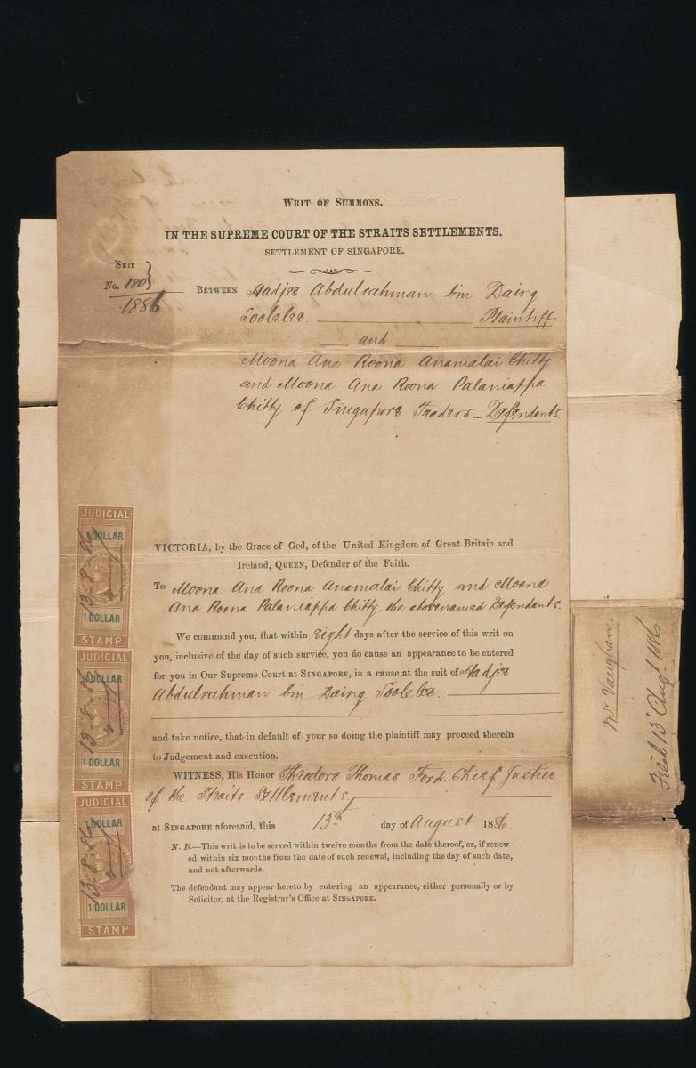 This is a writ of summons issued on 9 October 1889 to A. Annamalai, one of the defendants in the court case between Navenaravena Cheena Ravena Nama Letchman Chitty (plaintiff) and Yeo Kian Guan (defendant). It is part of a collection of legal documents from the 19th and early 20th centuries which provides a glimpse into the work of the notable personalities who left their mark on Singapore’s legal history, and the economic and other transactions undertaken by ordinary immigrants in 19th century Singapore that tell stories of misfortune and indebtedness which would otherwise have disappeared from history.