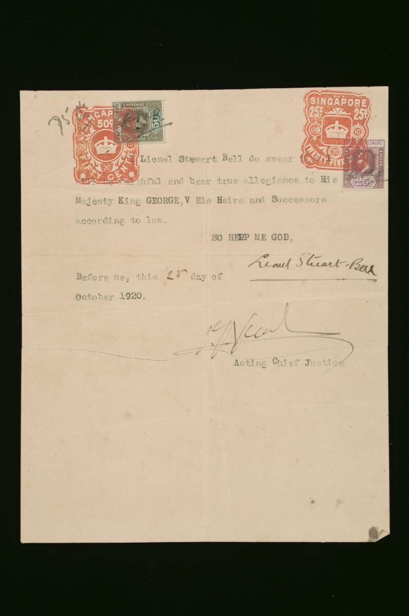 This is an oath sworn on 28 March 1877 by Daniel Jacob Hendrick, a clerk to Mr Edwin Koek, concerning the administration of the estate of the deceased Tan Poh Je. It is part of a collection of legal documents from the 19th and early 20th centuries which provides a glimpse into the work of the notable personalities who left their mark on Singapore’s legal history, and the economic and other transactions undertaken by ordinary immigrants in 19th century Singapore that tell stories of misfortune and indebtedness which would otherwise have disappeared from history.