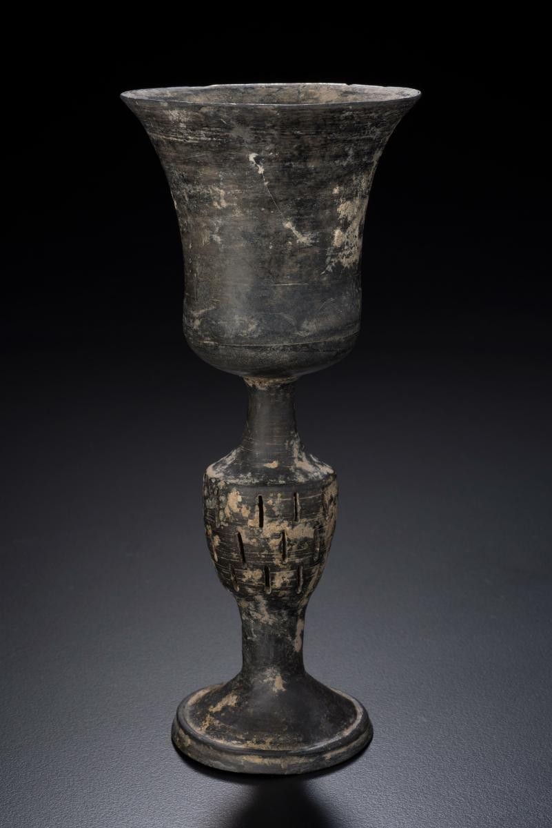 This porcelain stemcup has a domed foot, a high stem and an elongated deep bowl with a partially broken flared rim. River landscapes featuring trees, pavilions, bridges and figures, are painted in four vertical panels in underglaze blue. Used for drinking wine, this cup is unique as it does not have a traditional Chinese shape and was probably modelled after European wine glasses or goblets to suit European taste. This piece was part of a sizable cargo of Chinese export ceramics and porcelain uncovered from a late 17th century shipwreck near Vung Tau, Vietnam. Sunk on the way to Batavia from China, the cargo on this ship would have eventually made it way to the European market where Chinese ceramics were popular and much valued. Although expensive, porcelain became the fashion among the class of new rich merchants and bourgeoisie in Europe.