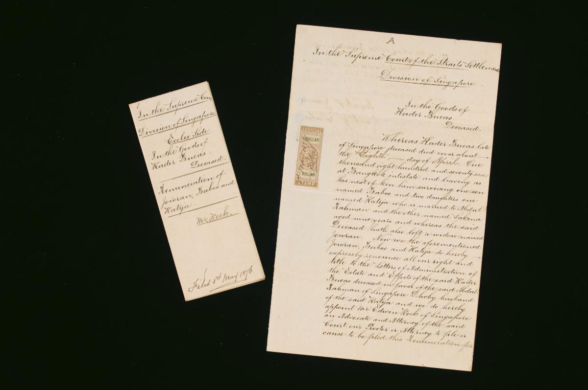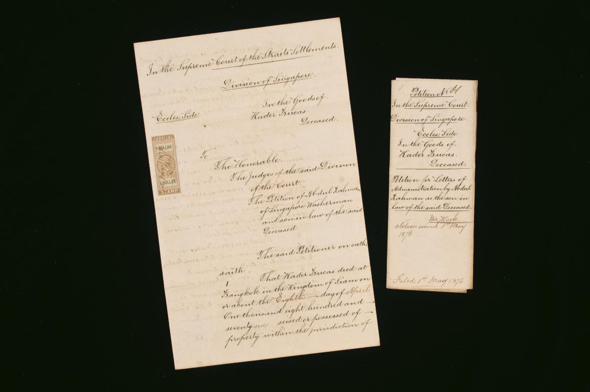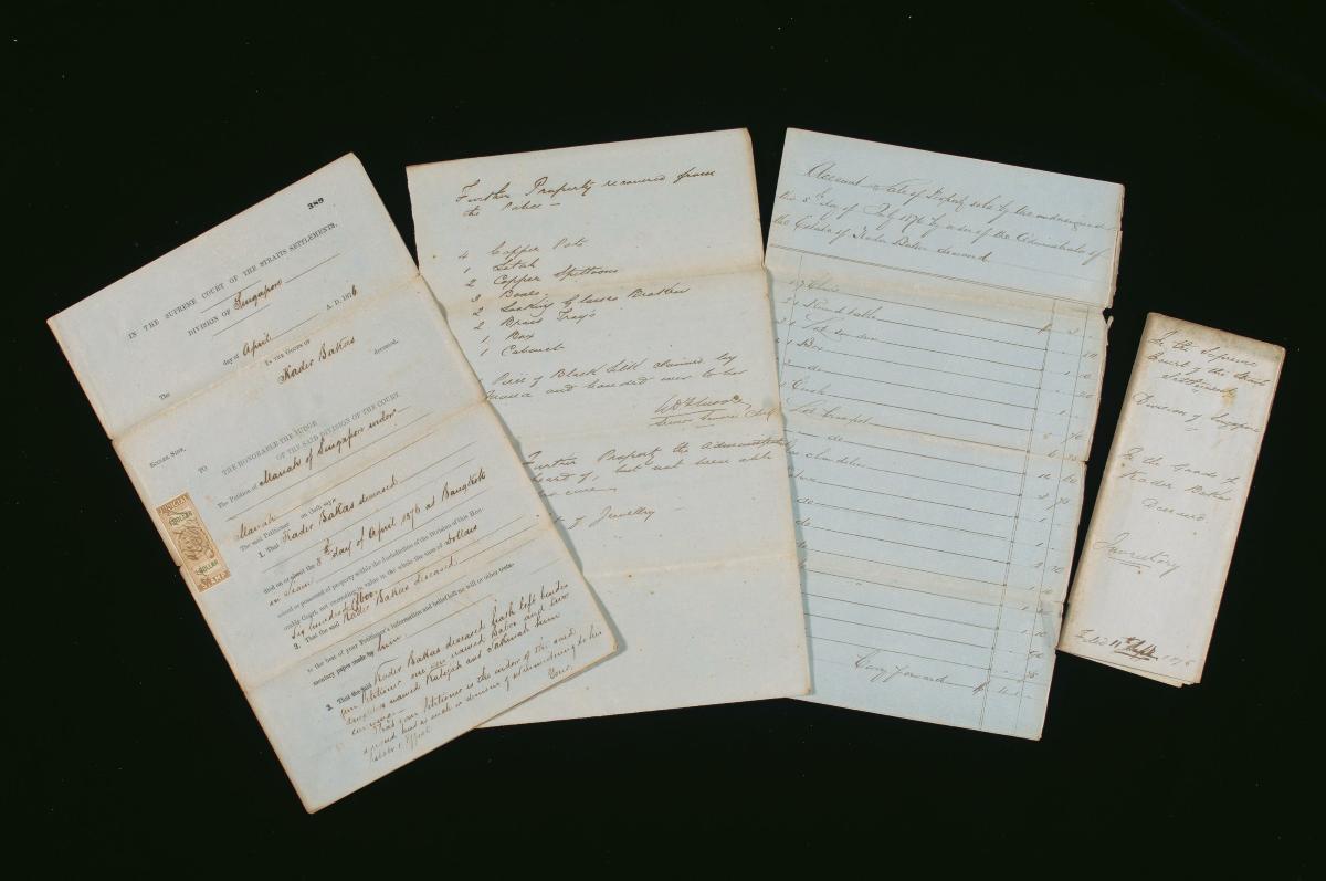 This is an account of the reclaimed property of Kader Bucas taken from Palee, among others which the administrator had been unable to secure. It is part of a collection of legal documents from the 19th and early 20th centuries which provides a glimpse into the work of the notable personalities who left their mark on Singapore’s legal history, and the economic and other transactions undertaken by ordinary immigrants in 19th century Singapore that tell stories of misfortune and indebtedness which would otherwise have disappeared from history.