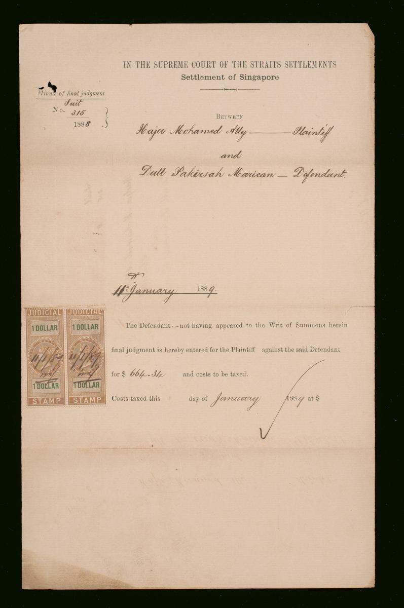 This is an order moved by Braddell on 30 April 1888 as Counsel for the plaintiff in the suit between Mohamed Ally Abdul Gaffoor (plaintiff) and Leicester Ho (defendant). It is part of a collection of legal documents from the 19th and early 20th centuries which provides a glimpse into the work of the notable personalities who left their mark on Singapore’s legal history, and the economic and other transactions undertaken by ordinary immigrants in 19th century Singapore that tell stories of misfortune and indebtedness which would otherwise have disappeared from history.