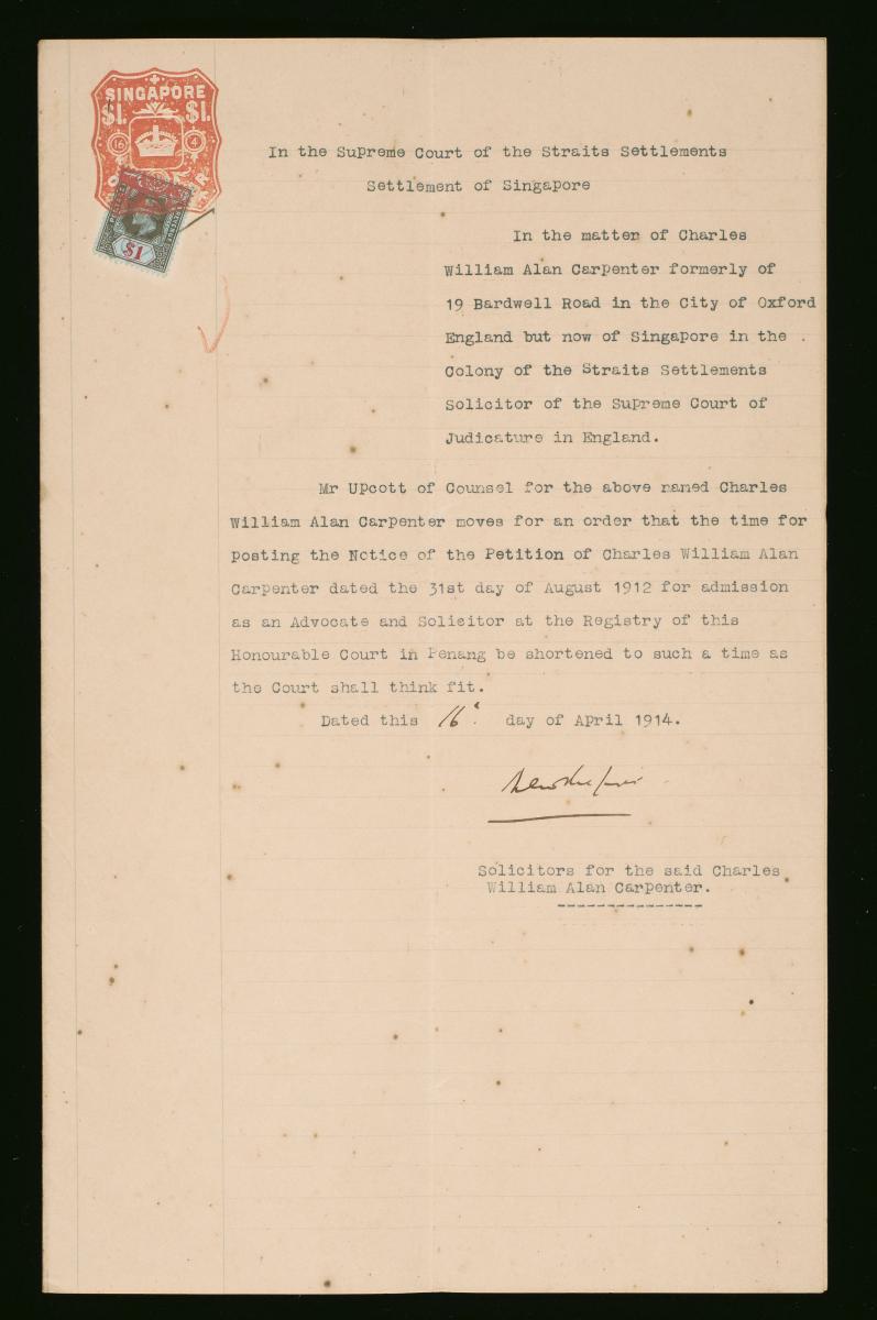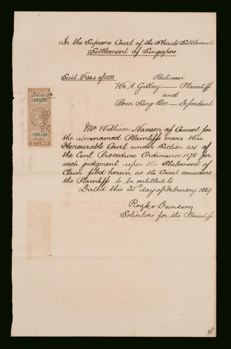 This is a court order moved by Mr Donaldson as the Counsel for the plaintiffs in the suit between the Tanjong Pagar Dock Company (plaintiffs) and Syed Abdulrahman bin Allie Aljunied (defendant). It is part of a collection of legal documents from the 19th and early 20th centuries which provides a glimpse into the work of the notable personalities who left their mark on Singapore’s legal history, and the economic and other transactions undertaken by ordinary immigrants in 19th century Singapore that tell stories of misfortune and indebtedness which would otherwise have disappeared from history.