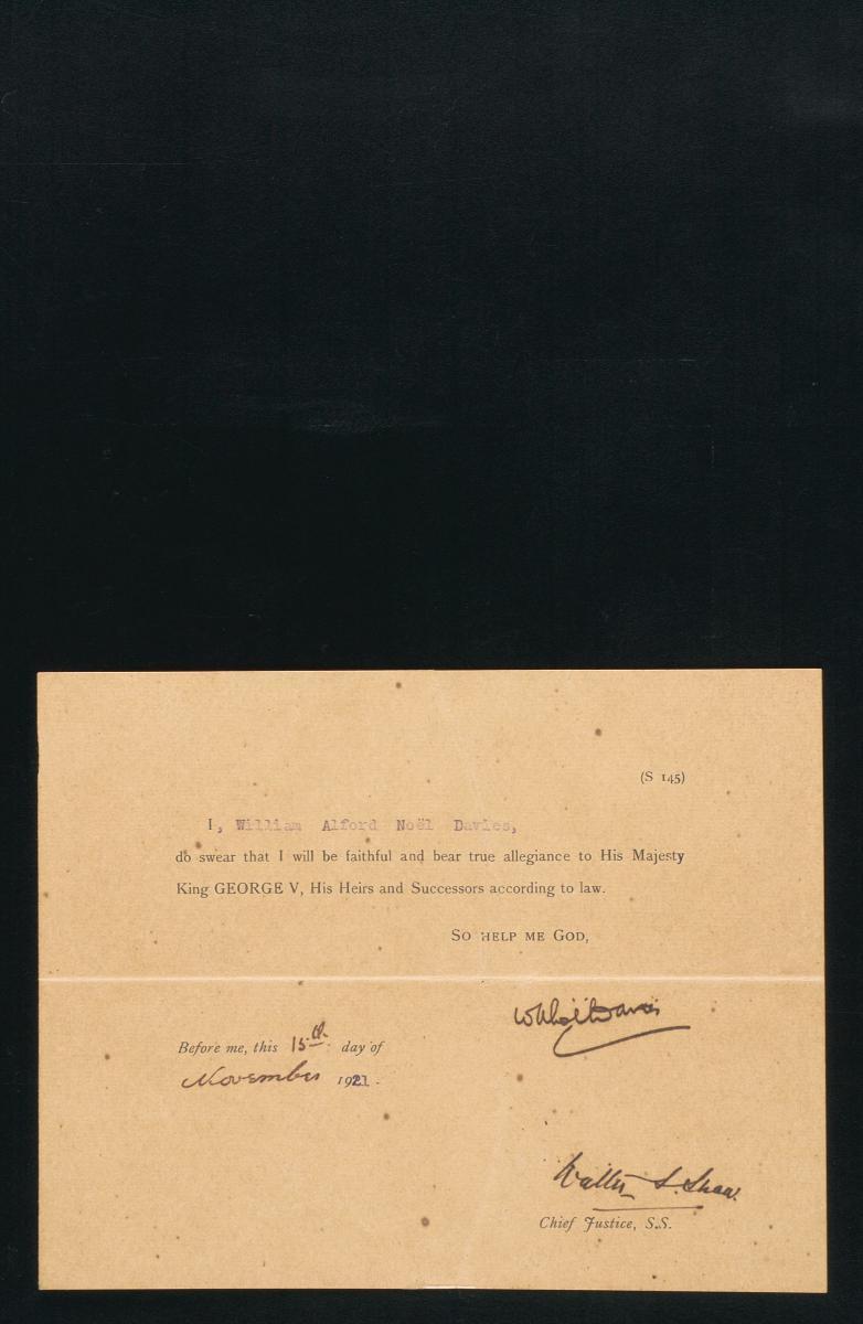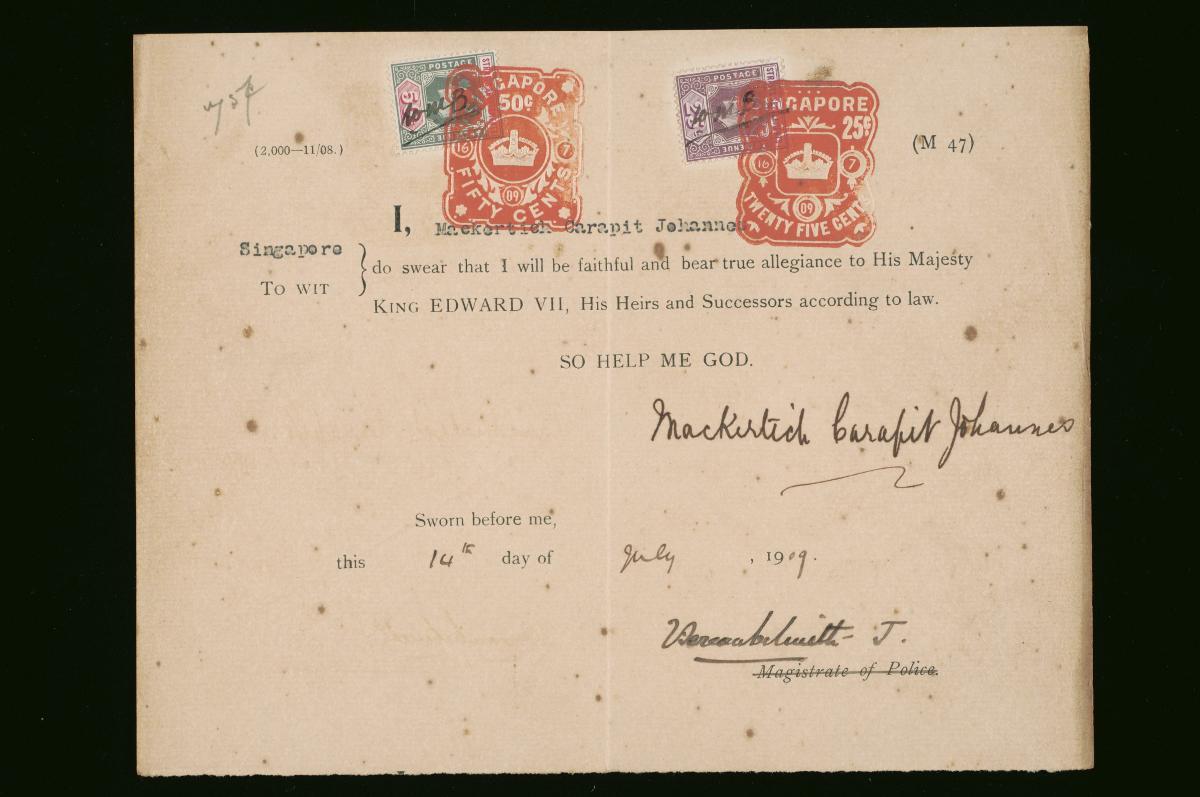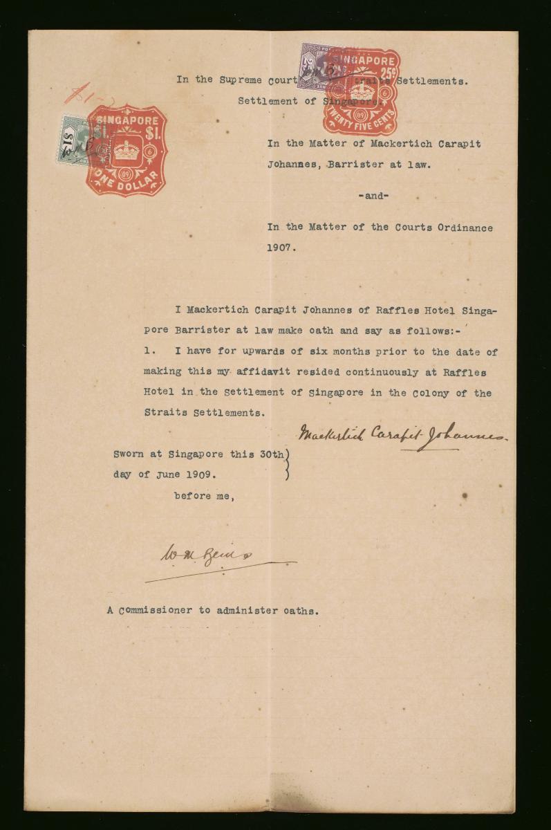This is an oath sworn on 22 May 1876 by Daniel Jacob Hendricks, clerk to Edwin Koek, concerning the administration of the estate of Kader Bucas. It is part of a collection of legal documents from the 19th and early 20th centuries which provides a glimpse into the work of the notable personalities who left their mark on Singapore’s legal history, and the economic and other transactions undertaken by ordinary immigrants in 19th century Singapore that tell stories of misfortune and indebtedness which would otherwise have disappeared from history.
