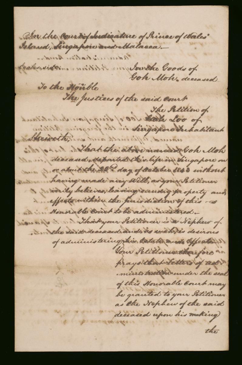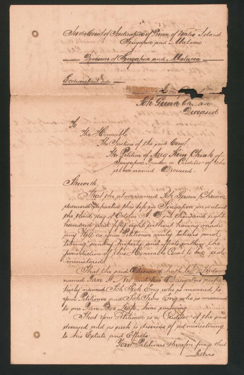 This is the petition of Loo Guan Neo of Singapore concerning the administration of the estate of the deceased Toh Sye. It is part of a collection of legal documents from the 19th and early 20th centuries which provides a glimpse into the work of the notable personalities who left their mark on Singapore’s legal history, and the economic and other transactions undertaken by ordinary immigrants in 19th century Singapore that tell stories of misfortune and indebtedness which would otherwise have disappeared from history.