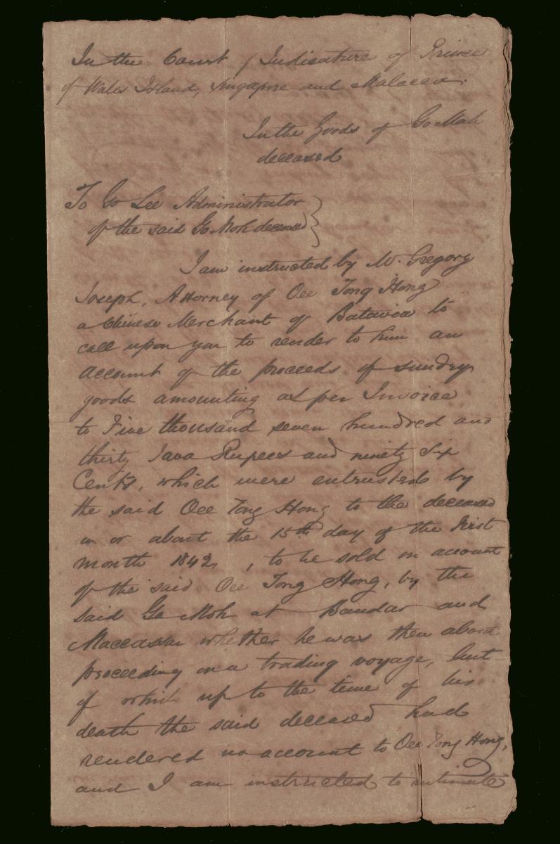 This is a document dated 13 March 1879 concerning the administration of the estate of Goh Tock Swee. It states that no action was to be taken with regards to the estate of the deceased without the knowledge of Goh Kim Swee. It is part of a collection of legal documents from the 19th and early 20th centuries which provides a glimpse into the work of the notable personalities who left their mark on Singapore’s legal history, and the economic and other transactions undertaken by ordinary immigrants in 19th century Singapore that tell stories of misfortune and indebtedness which would otherwise have disappeared from history.