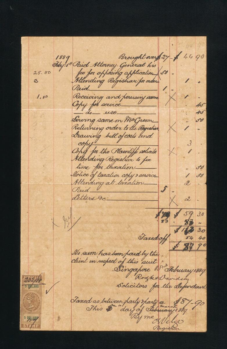 This is an account of the profits from 24 January 1888 to 11 February 1888, concerning the suit between Tay Siew Teaw and others (plaintiffs) and Chea Geak Koon and Taw Sock Unn (defendants). It is part of a collection of legal documents from the 19th and early 20th centuries which provides a glimpse into the work of the notable personalities who left their mark on Singapore’s legal history, and the economic and other transactions undertaken by ordinary immigrants in 19th century Singapore that tell stories of misfortune and indebtedness which would otherwise have disappeared from history.