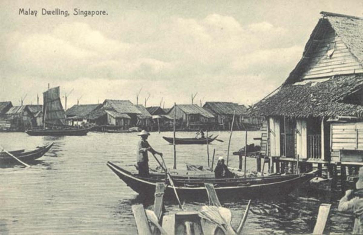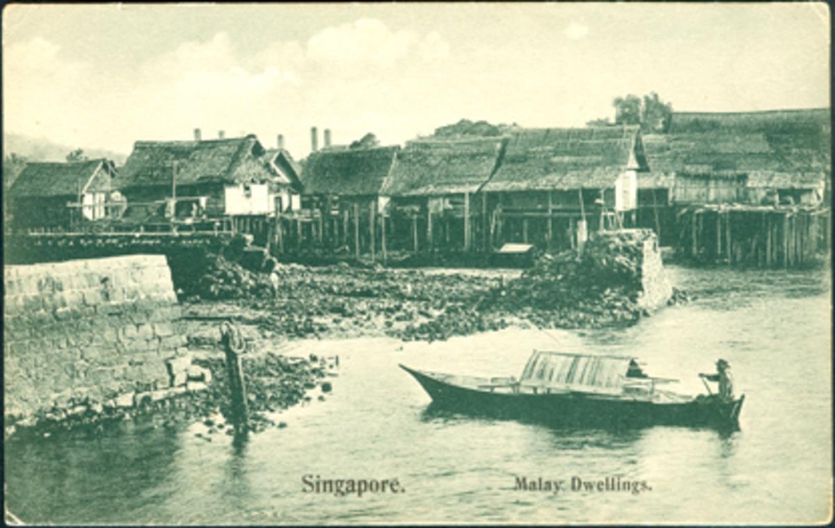 This is a picture postcard of a Malay village. The basic form and structure of most Malay 'kampong' houses are similar. Two distinctive features of a Malay 'kampong' house are the high, sloping roof with gables at both ends and the raised floor. The roof is covered with 'attap', which is made from palm fronds. The raised floor facilitates ventilation, secures the house against attacks by wild animals and helps the inhabitants to cope with flashfloods and ground dampness caused by the hot and humid tropical climate with heavy rain. A Malay village is usually self-sufficient, with its own water supply, place of worship, farm, school, shops and even a cemetery.