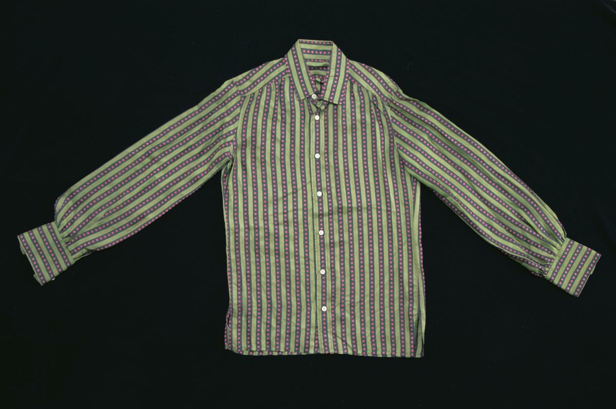 A pink jacket with large pink buttons and green fish prints by Yves Saint Laurent