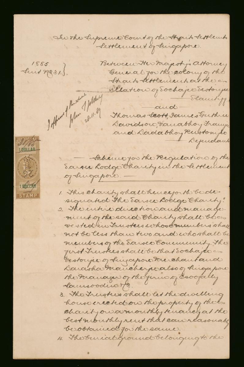 These are the proposed minutes concerning the suit between the Attorney General, who was acting on behalf of the plaintiff Pochajee Pestorjee, and Thomas Scott, James Guthrie Davidson, Vamathoy Franjee and Dadabhoy Rustomjee (defendants). They are part of a collection of legal documents from the 19th and early 20th centuries which provides a glimpse into the work of the notable personalities who left their mark on Singapore’s legal history, and the economic and other transactions undertaken by ordinary immigrants in 19th century Singapore that tell stories of misfortune and indebtedness which would otherwise have disappeared from history.