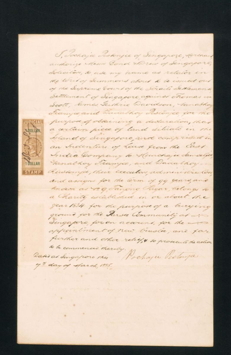 This is an oath sworn by Pochajee Pestorjee, the plaintiff in the suit between the Attorney General, who was acting on behalf of Pestorjee, and Thomas Scott, James Guthrie Davidson, Vamathoy Franjee and Dadabhoy Rustomjee (defendants). It is part of a collection of legal documents from the 19th and early 20th centuries which provides a glimpse into the work of the notable personalities who left their mark on Singapore’s legal history, and the economic and other transactions undertaken by ordinary immigrants in 19th century Singapore that tell stories of misfortune and indebtedness which would otherwise have disappeared from history.