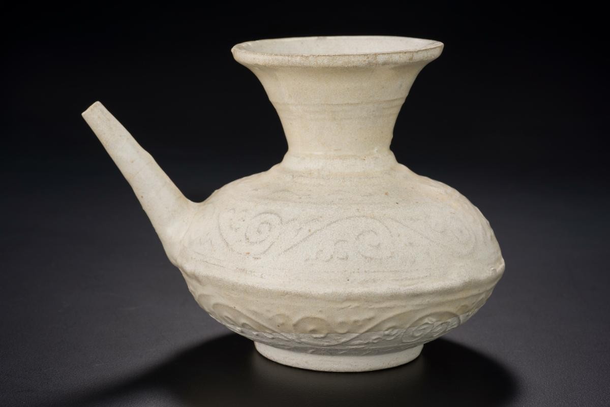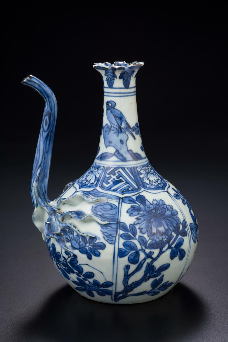 This unusually small kendi (water pot) has a tapered spout and bold tones of underglaze blue decoration with traces of red enamel and gilding. Finely painted motifs of mythical lions amidst clouds are featured on the exterior. This form was popular in Southeast Asia, where local potters reproduced the shape in earthenware. Although heavily influenced by the Chinese ceramic tradition, Vietnam materials and potting styles are unique. Technically not ‘porcelain’, which is translucent and pure white, these stonewares are different in appearance from Chinese and other Southeast Asian ceramics. Vietnamese wares are typically more heavily potted and have an off-white clay body. Cobalt oxide could have been imported from West Asia via China to produce the blue tones.Vietnam entered the international trade during the 14th century and produced the greatest volume and variety of wares for Southeast Asia, particularly Indonesia, the Philippines and Malaysia. However, by the 16th century, due to intense competition from the Chinese kilns, the export of Vietnamese wares to these markets was greatly reduced.