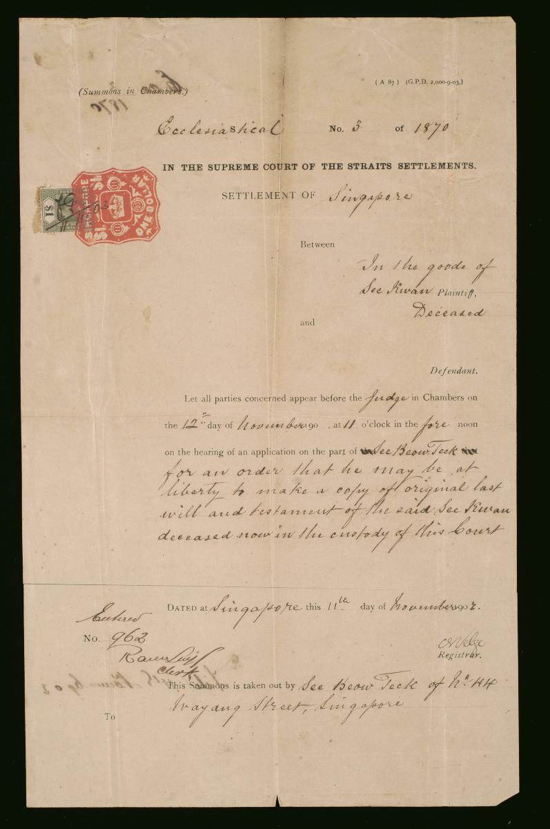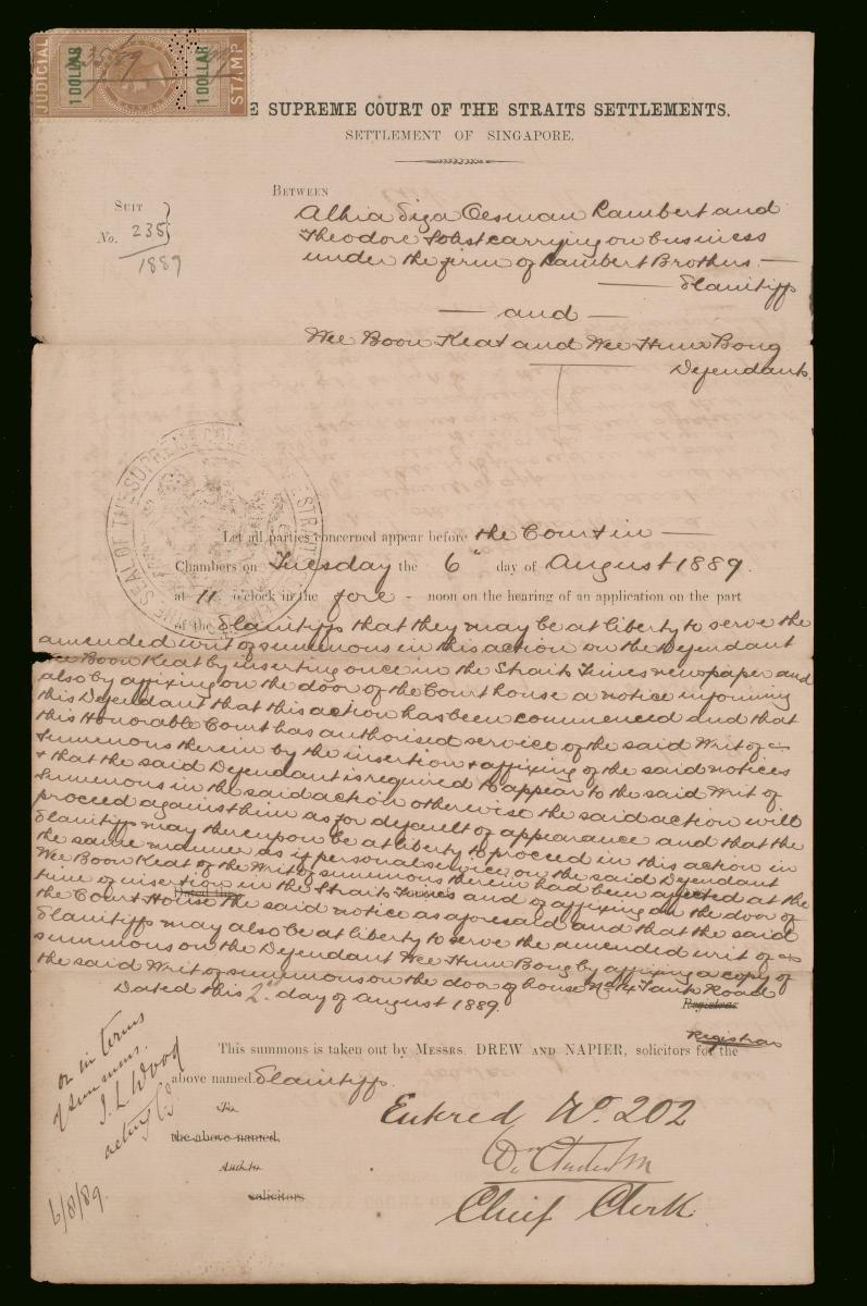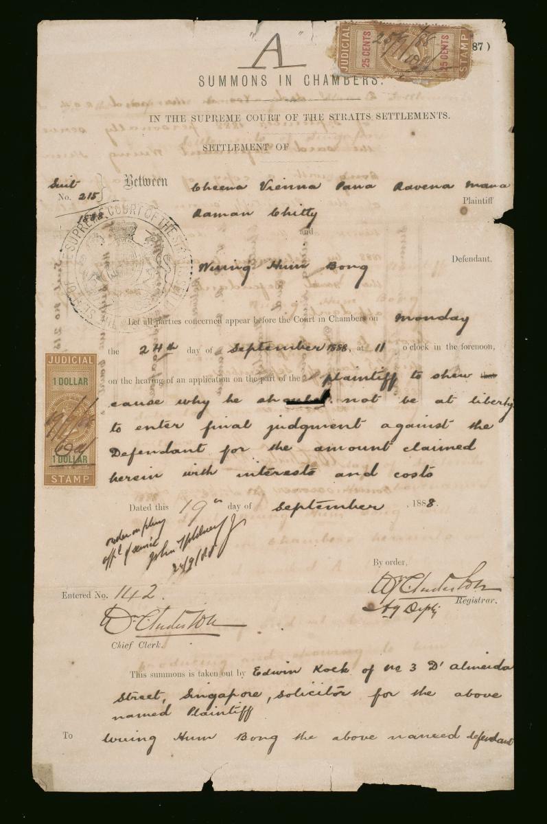 This is the summons in chambers for 11 October 1888 taken out by Alfred Henry Drew, the solicitor for the second defendant, and directed to the plaintiffs and their solicitor, J.D. Vaughn Esquire. It concerns the case between Woona Slayman Janor and others (plaintiffs), and Mohamed Allie and others (defendants). This document is part of a collection of legal documents from the 19th and early 20th centuries which provides a glimpse into the work of the notable personalities who left their mark on Singapore’s legal history, and the economic and other transactions undertaken by ordinary immigrants in 19th century Singapore that tell stories of misfortune and indebtedness which would otherwise have disappeared from history.