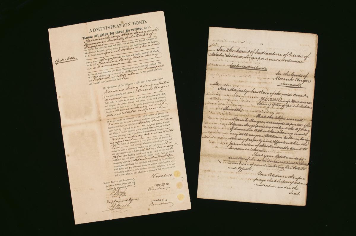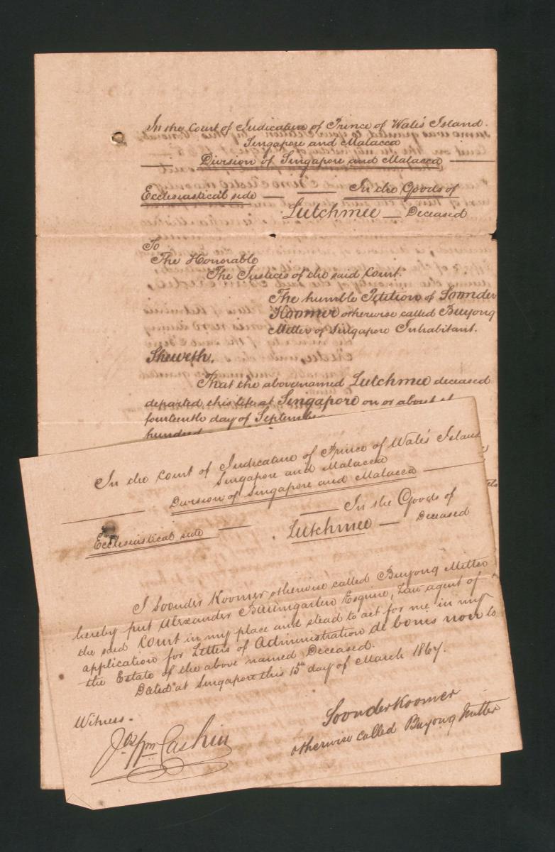 This is a document concerning the estate of Lutchmee dated 21 April 1871. It details the motion moved by John Simons Atchinson on behalf of Kooder Somder (otherwise called Buyong Misser) on the grounds stated in the affidavit of the said Soonder Koomer and Soopramania Chitty. It is part of a collection of legal documents from the 19th and early 20th centuries which provides a glimpse into the work of the notable personalities who left their mark on Singapore’s legal history, and the economic and other transactions undertaken by ordinary immigrants in 19th century Singapore that tell stories of misfortune and indebtedness which would otherwise have disappeared from history.