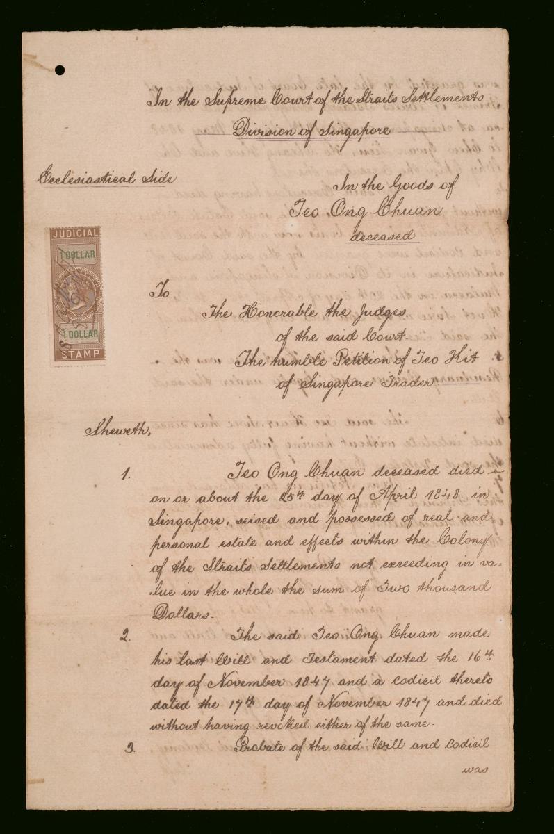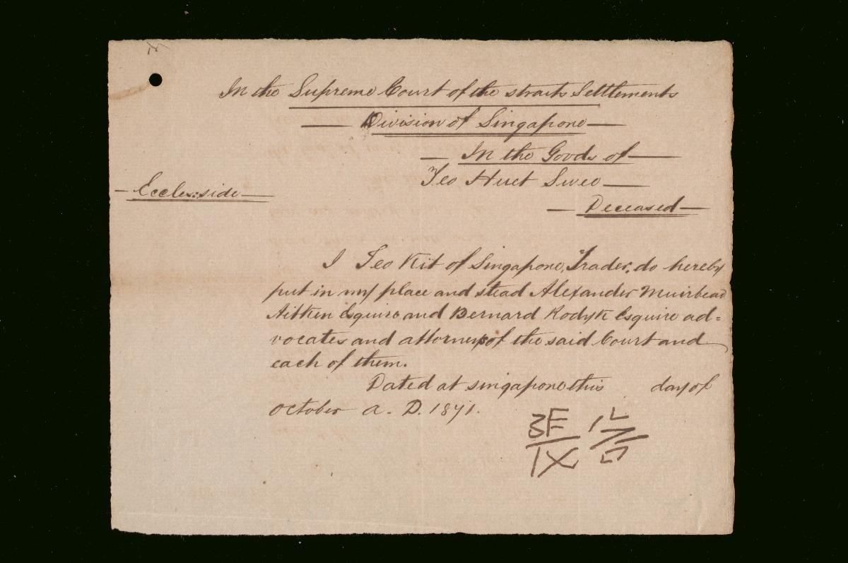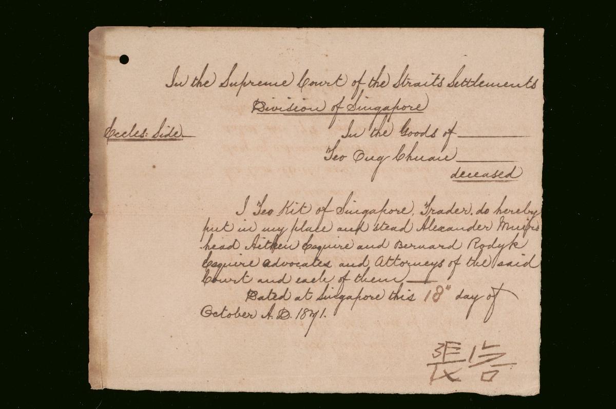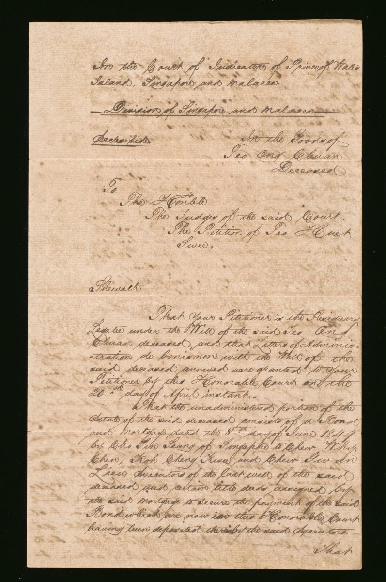 This is the cover page of the petition of Teo Kit for the letters of administration of the estate of Teo Ong Chuan to be granted de bonis non (Latin for non-administered goods). The letters of administration were granted to the petitioner on 20 October 1871. It is part of a collection of legal documents from the 19th and early 20th centuries which provides a glimpse into the work of the notable personalities who left their mark on Singapore’s legal history, and the economic and other transactions undertaken by ordinary immigrants in 19th century Singapore that tell stories of misfortune and indebtedness which would otherwise have disappeared from history.