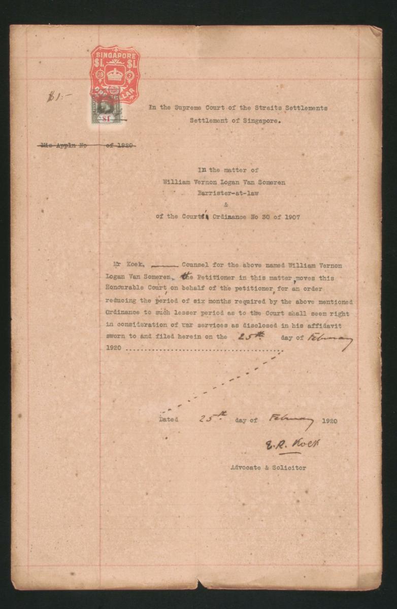 This is a motion paper issued on 7 May 1872 concerning the administration of the estate of the deceased Vanjoor. It was moved by Braddell, the legal representative for Kader Kunny, who move an order for the Attorney General of the court to pay his client a sum of $762.75 to the credit of the estate of the deceased.This document is part of a collection of legal documents from the 19th and early 20th centuries which provides a glimpse into the work of the notable personalities who left their mark on Singapore’s legal history, and the economic and other transactions undertaken by ordinary immigrants in 19th century Singapore that tell stories of misfortune and indebtedness which would otherwise have disappeared from history.